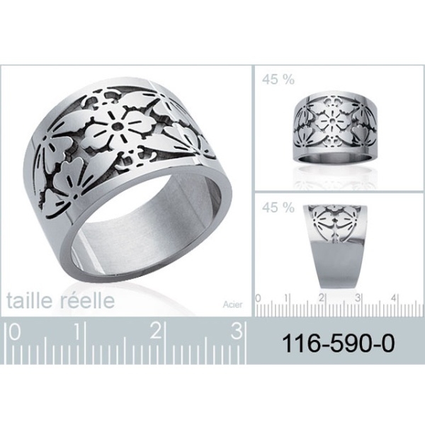 Description Bague en acier. Largeur 16 mm Matière(s) Acier . L'acier utilisé dans la bijouterie existe sous plusieurs qualités. Nous utilisons principalement la qualité 316L, qualité qui est utilisée en chirurgie. Cet acier est donc inoxydable et reste très résistant. Couleur(s) dominante(s) Argenté Public Adulte . Genre Femme . Saison Indémodable . Thème(s) Fleurs . Cliquez sur une matière, un thème, une couleur ou une collection pour voir tous les articles associés.