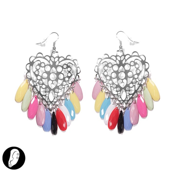 Boucles d'oreilles fantaisie en métal argenté et matières mélangées.