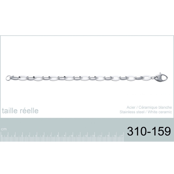Description Bracelet en acier et céramique. Longueur 19 cm [Guide des tailles] Largeur 8 mm Matière(s) Acier , Céramique . L'acier utilisé dans la bijouterie existe sous plusieurs qualités. Nous utilisons principalement la qualité 316L, qualité qui est utilisée en chirurgie. Cet acier est donc inoxydable et reste très résistant. Fermoir Mousqueton Couleur(s) dominante(s) Blanc Public Adulte . Genre Femme . Saison Indémodable . Rayon en magasin T45 Cliquez sur une matière, un thème, une couleur ou une collection pour voir tous les articles associés.