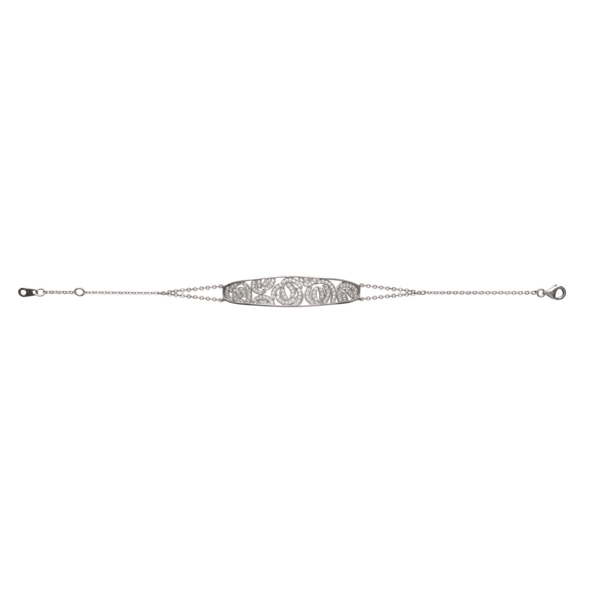 Description Bracelet en argent 925/000 rhodié et oxyde de zirconium. Longueur 16/18 cm [Guide des tailles] Largeur 10 mm Matière(s) Argent 925 rhodié , Zirconium . Afin de protéger votre bijou de l'oxydation naturelle de l'argent, il est recouvert d'une couche de rhodium (un métal rare et précieux) qui garantira sa brillance dans le temps et préviendra les risques d'allergie. Notez cependant, que le bijou est alors d'une teinte plus grisée et moins brillante que l'argent non rhodié. Poids d'argent 4,49 gramme(s) Fermoir Mousqueton Couleur(s) dominante(s) Argenté , Transparent Public Adulte . Genre Femme . Saison Indémodable . Cliquez sur une matière, un thème, une couleur ou une collection pour voir tous les articles associés.