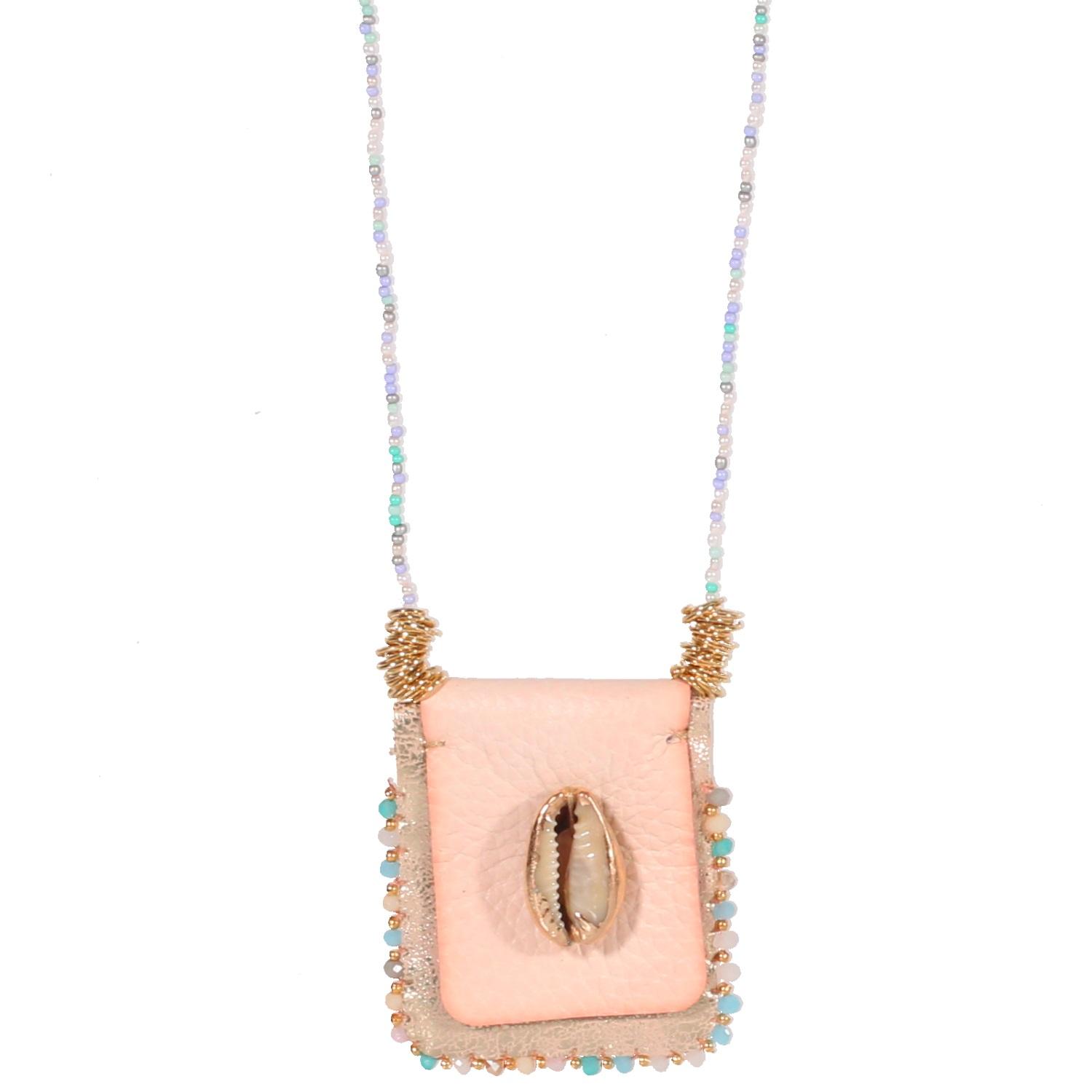 Collier sautoir fantaisie en métal doré, cristaux synthétiques, suédine et coquillage.