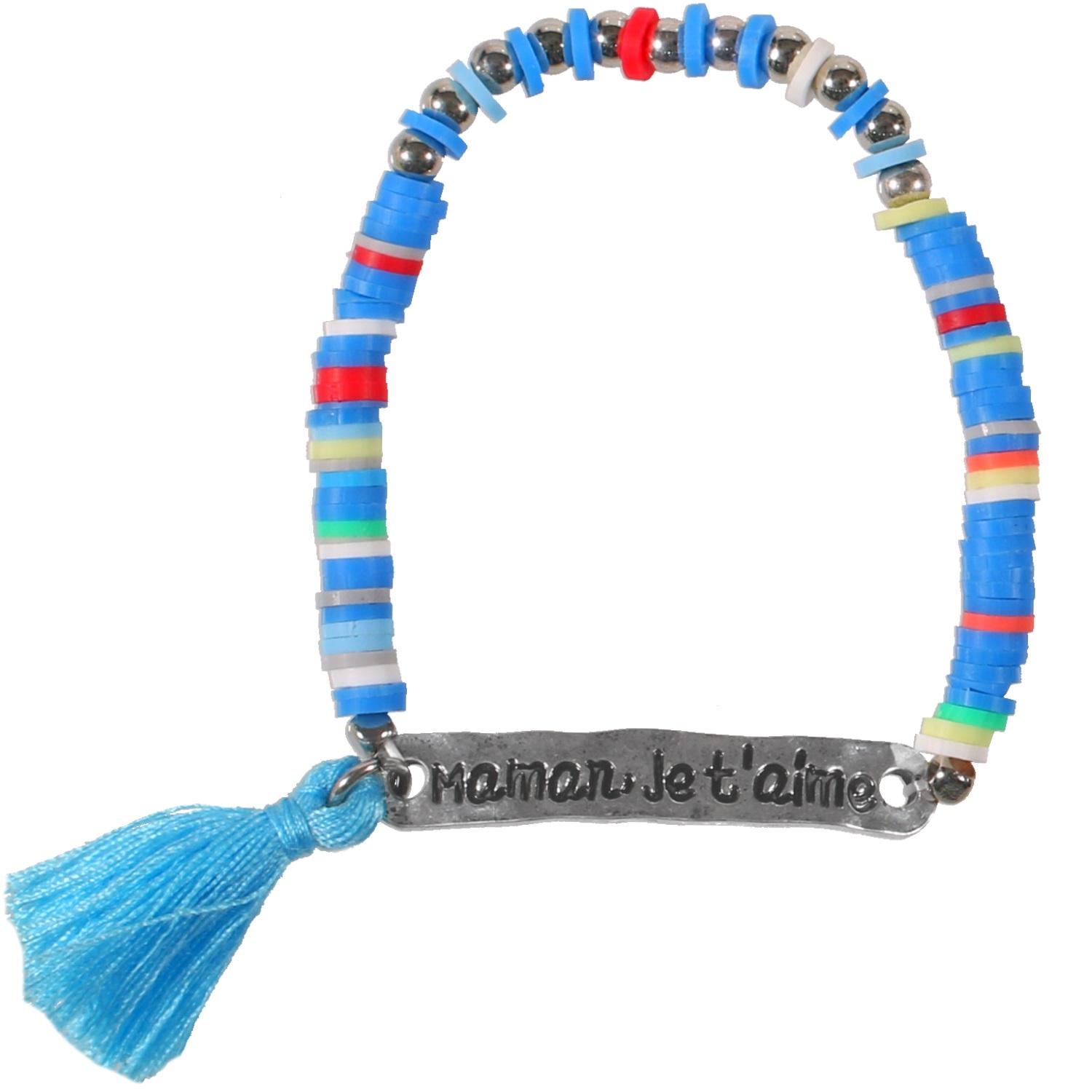 Bracelet fantaisie en métal argenté, textile et caoutchouc.