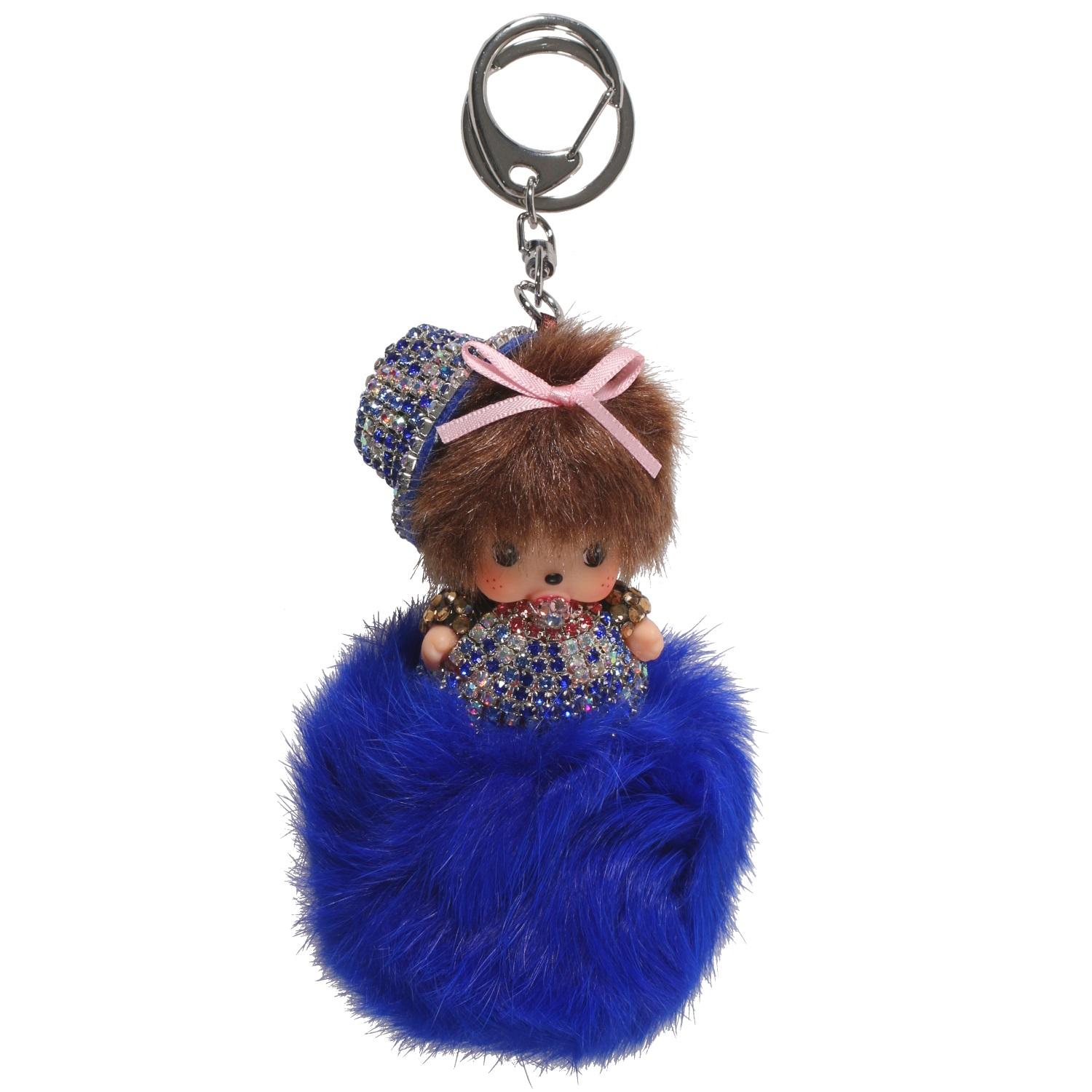 Porte-clés fantaisie en métal argenté, textile, plastique et cristaux synthétiques.