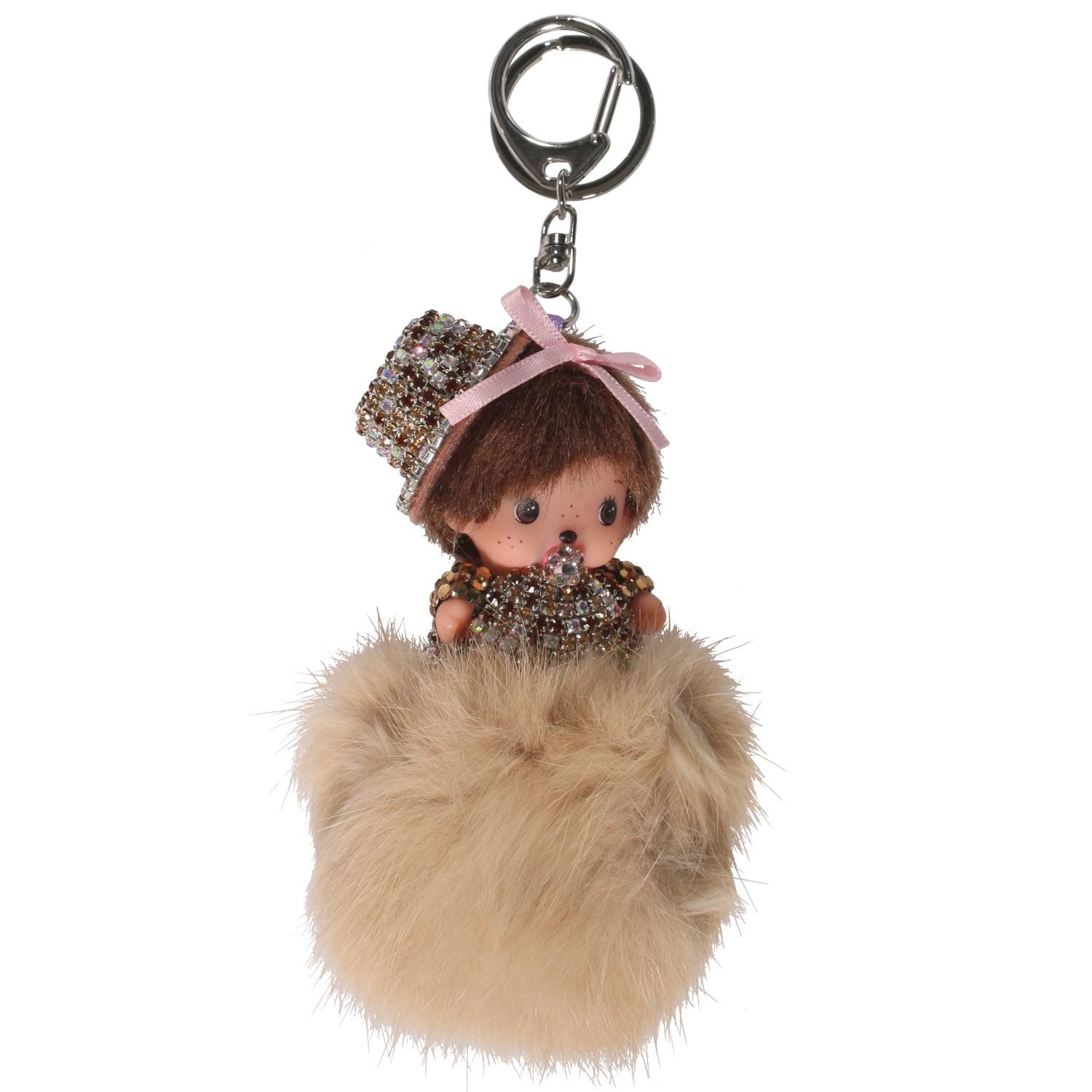 Porte-clés fantaisie en métal argenté, textile, plastique et cristaux synthétiques.