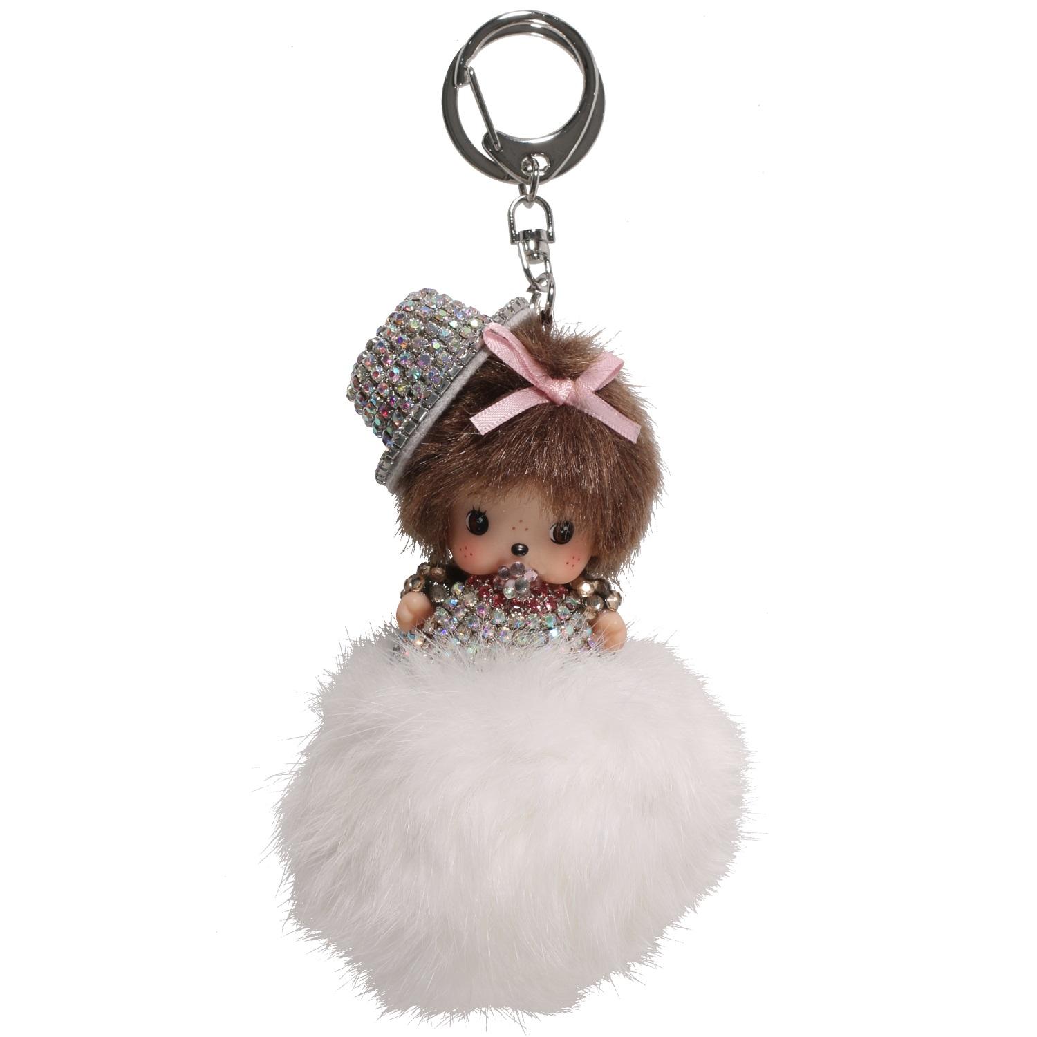 Porte-clés fantaisie en métal argenté, textile, plastique et cristaux synthétiques.