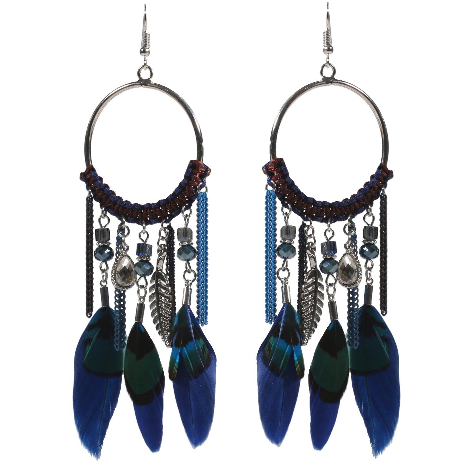 Boucles d'oreilles fantaisie en métal argenté, métal peint, rocaille, textile et plume.