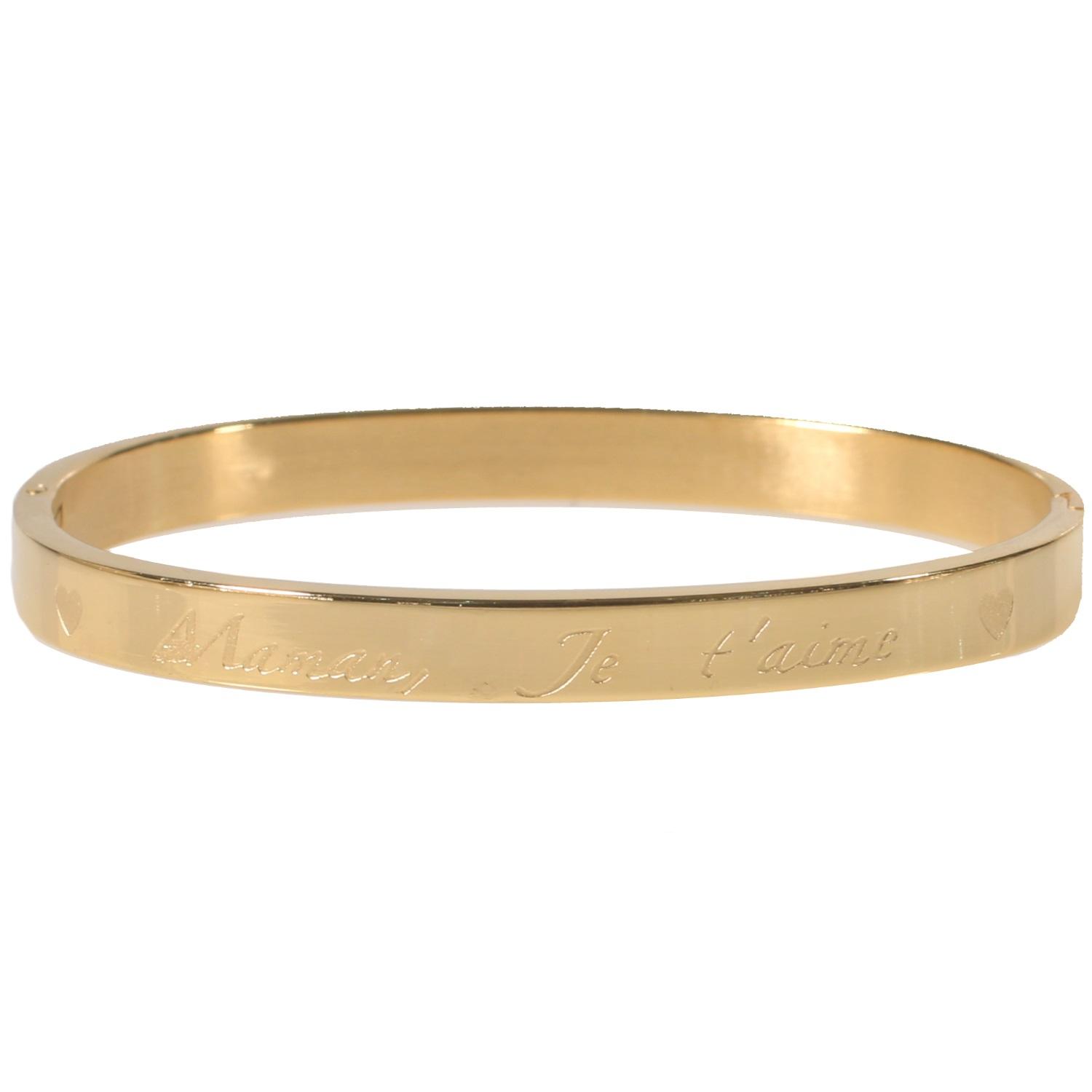 Description Bracelet jonc rigide en acier doré. Largeur 6 cm Diamètre 59 mm [Guide des tailles] Matière(s) Acier . L'acier utilisé dans la bijouterie existe sous plusieurs qualités. Nous utilisons principalement la qualité 316L, qualité qui est utilisée en chirurgie. Cet acier est donc inoxydable et reste très résistant. Fermoir Charnière À noter "Maman, Je t'aime" Couleur(s) dominante(s) Doré Public Adulte . Genre Femme . Saison Indémodable . Thème(s) Amour , Message . Collection Fête des mères Cliquez sur une matière, un thème, une couleur ou une collection pour voir tous les articles associés.