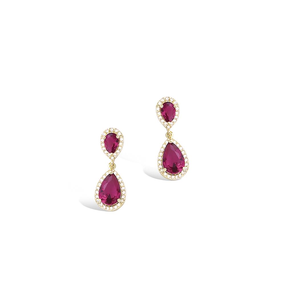 Boucles d'oreilles en plaqué or, verre rubis et oxydes de zirconium.