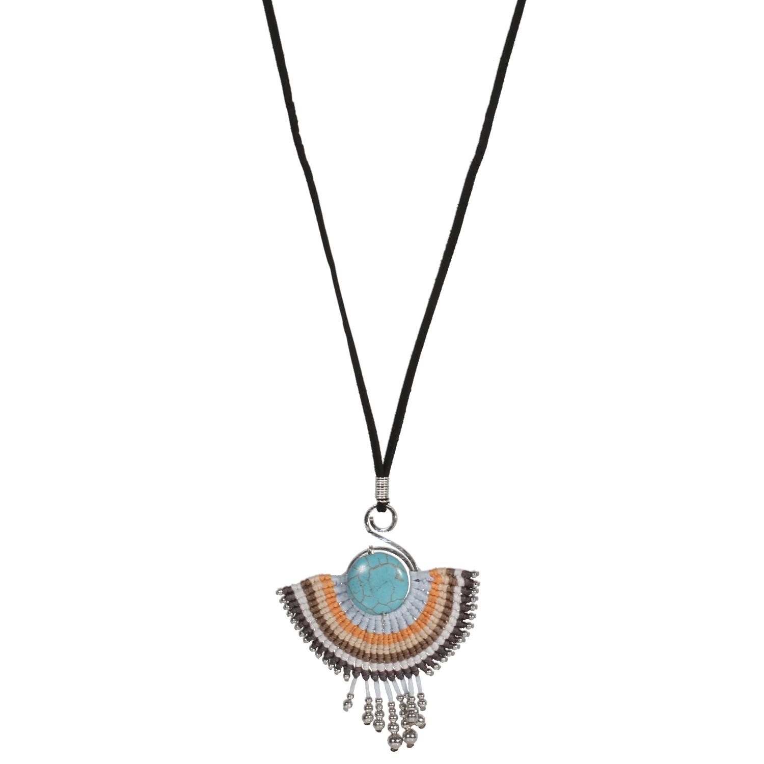 Collier sautoir fantaisie en métal argenté, suédine, résine et textile.
