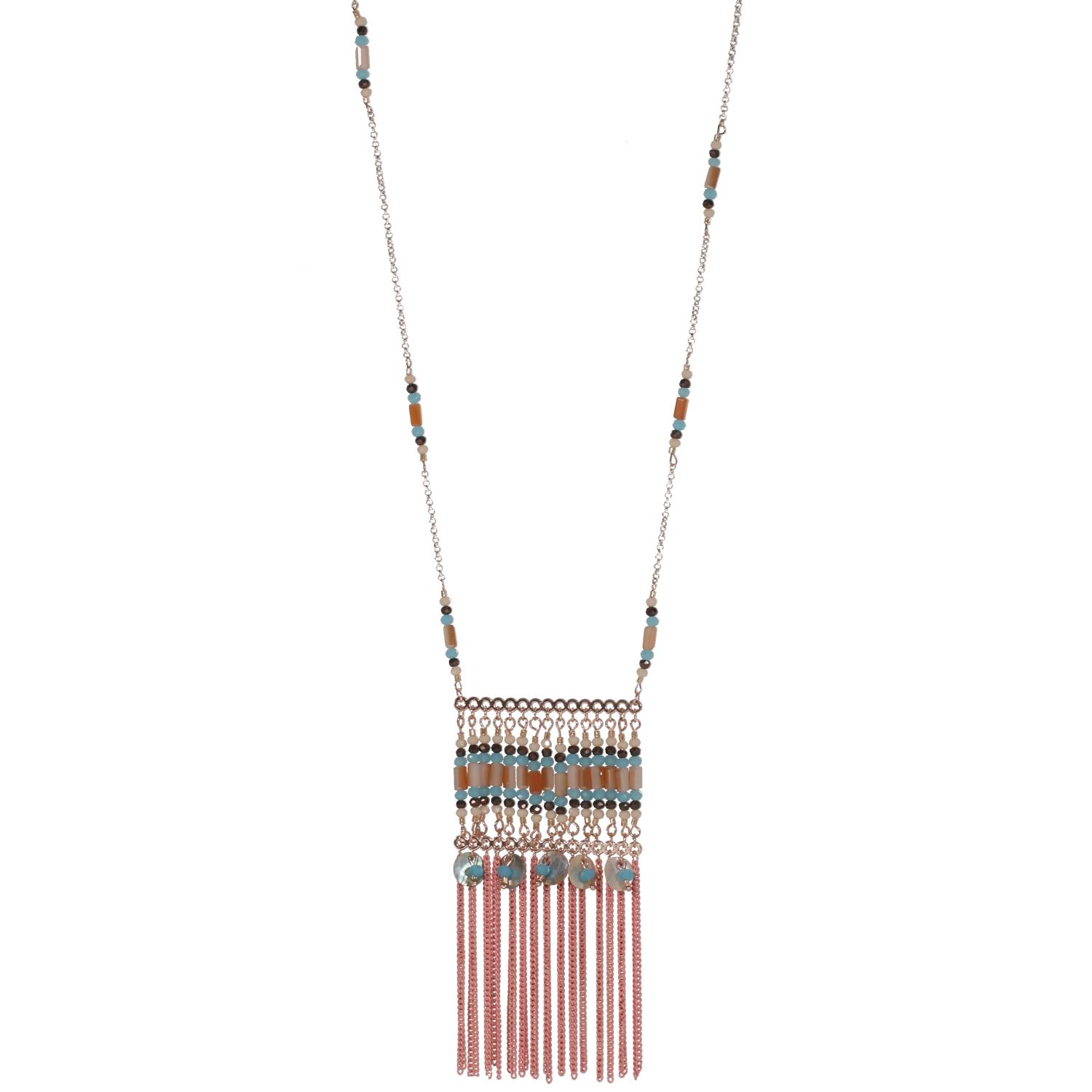 Collier sautoir en métal doré, métal rosé, métal peint, coquillage et rocaille.