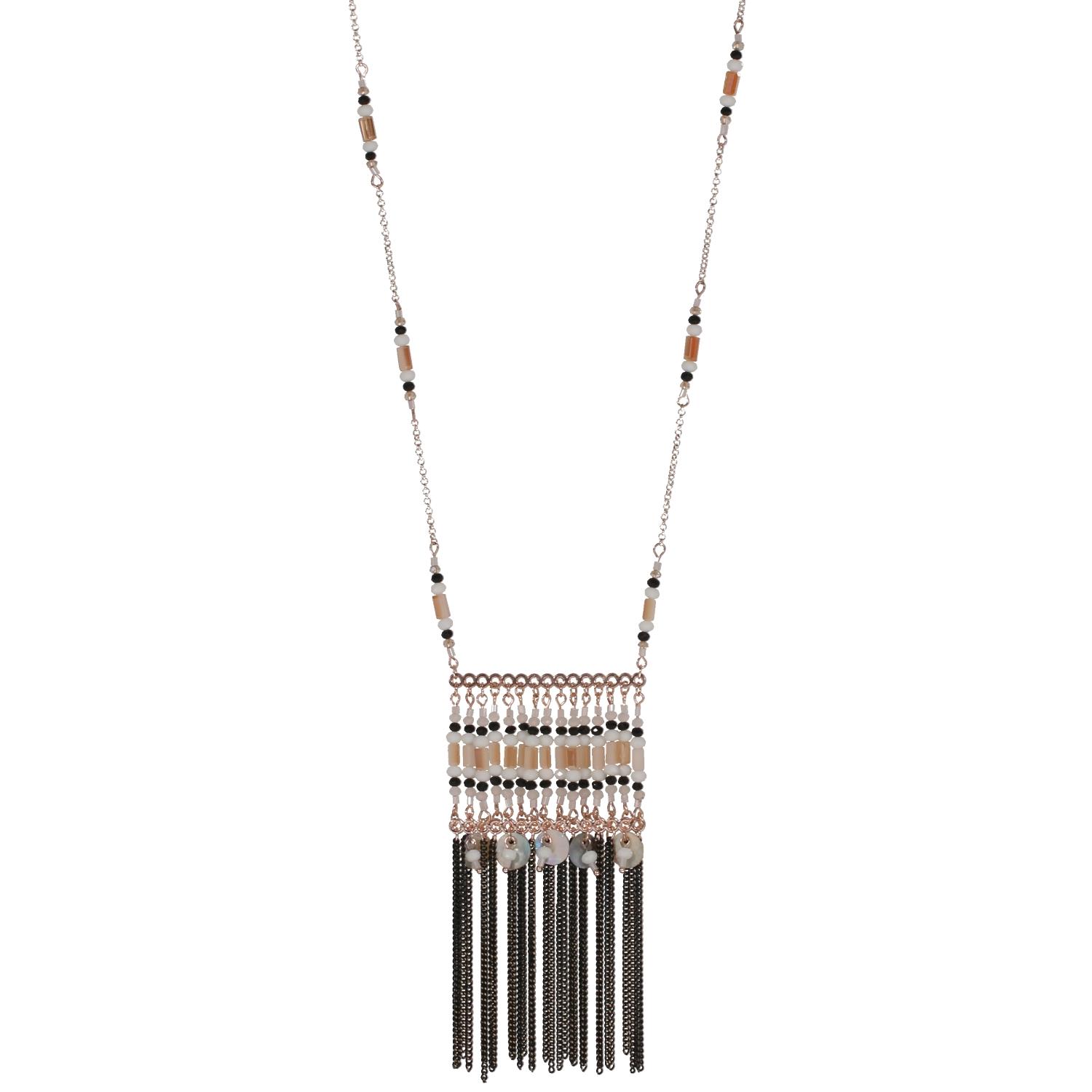 Collier sautoir en métal rosé, métal peint, coquillage et rocaille.