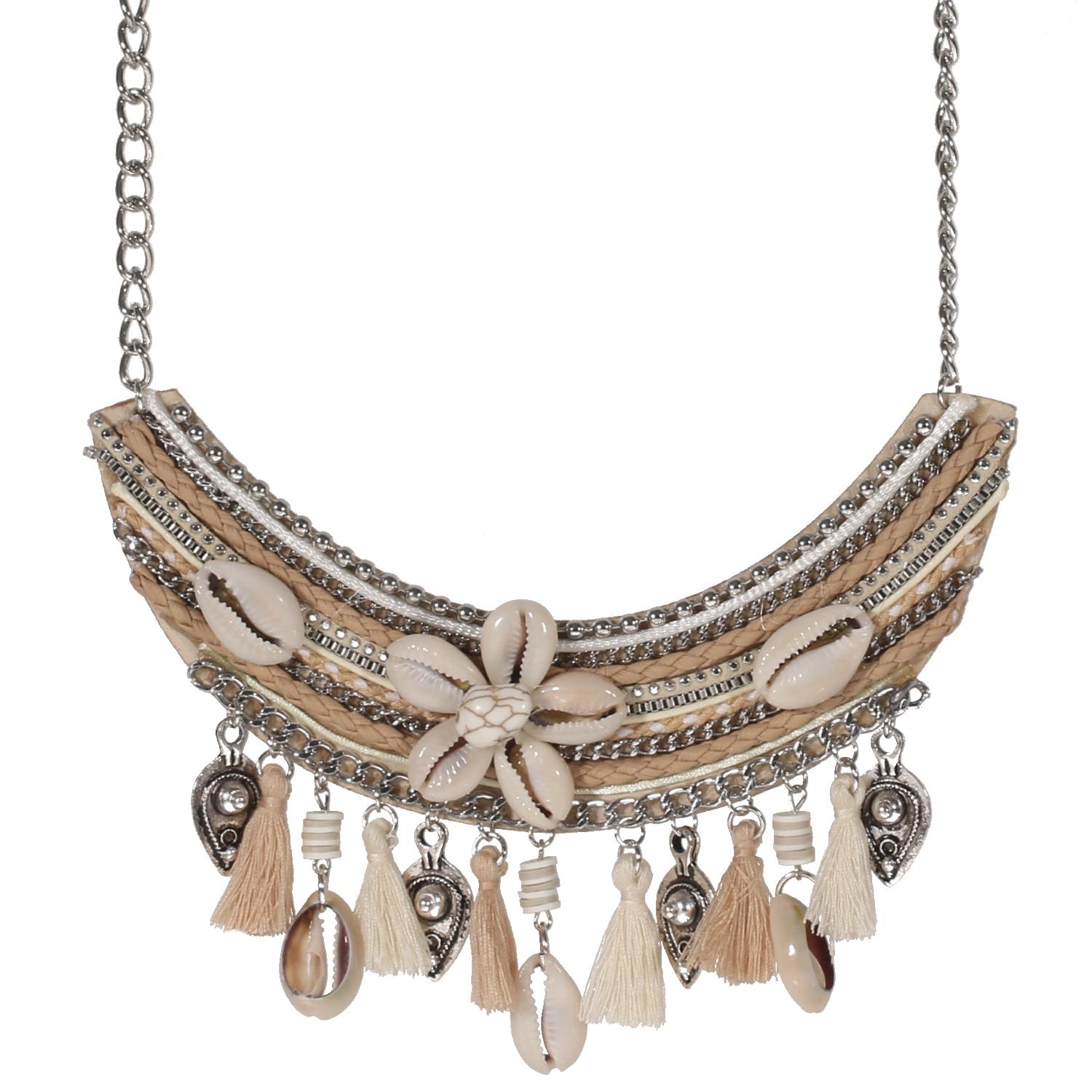 Collier fantaisie en métal argenté, textile, suédine, rocaille et coquillage.