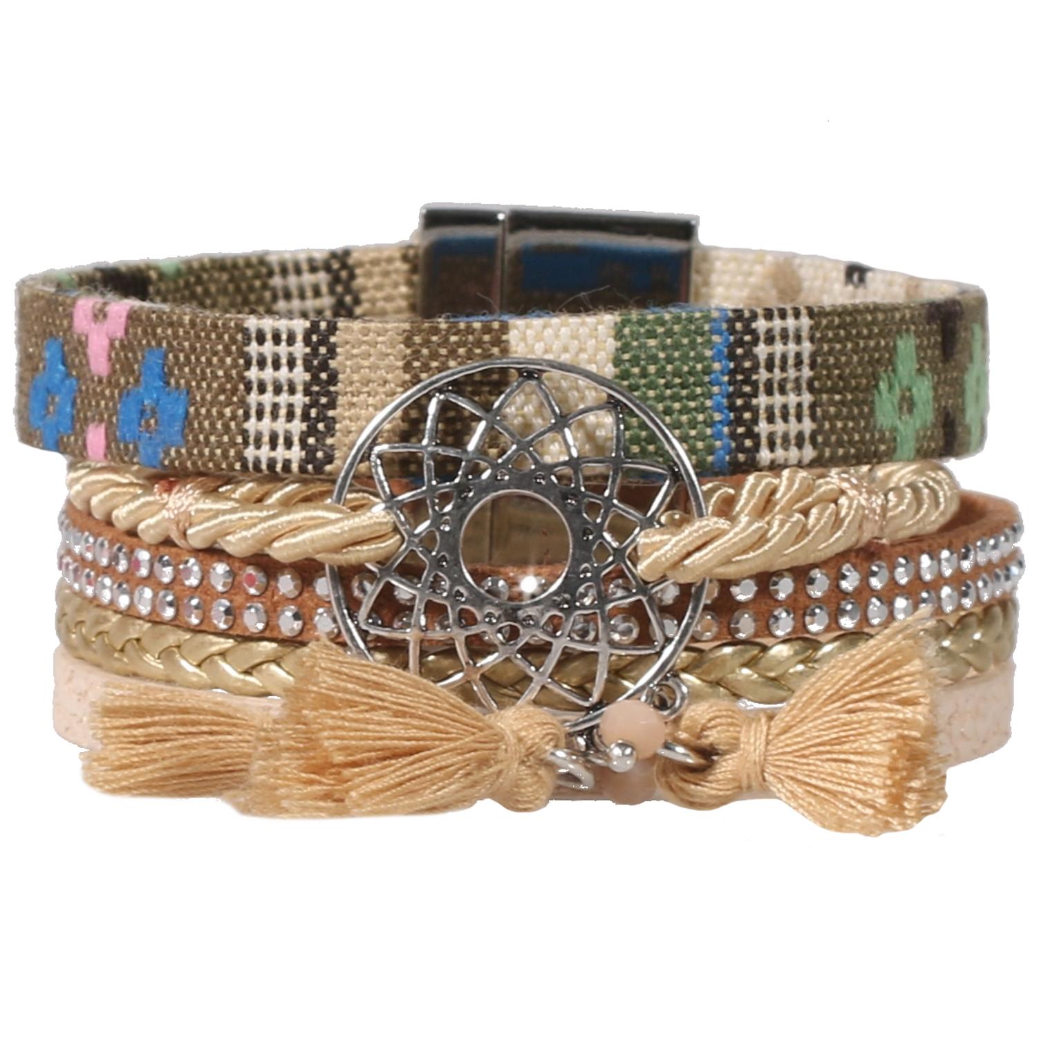 Bracelet fantaisie métal argenté, polyuréthane, textile, suédine et rocaille.