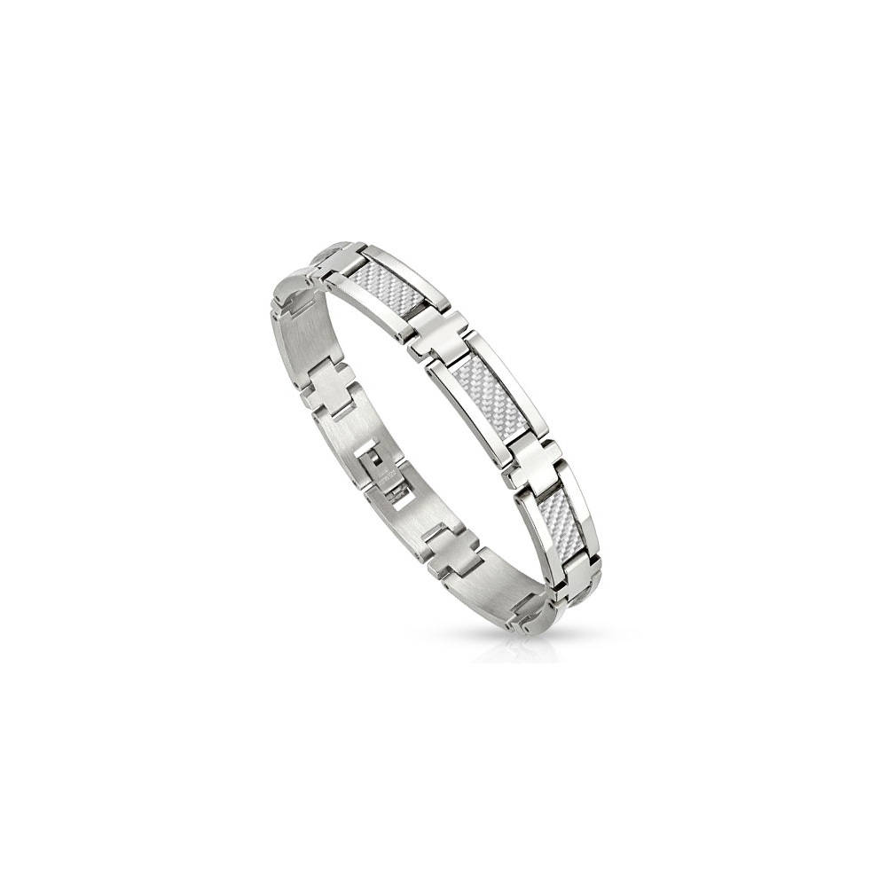 Description Bracelet en acier et carbone. Longueur 21 cm [Guide des tailles] Largeur 10 mm Matière(s) Acier . L'acier utilisé dans la bijouterie existe sous plusieurs qualités. Nous utilisons principalement la qualité 316L, qualité qui est utilisée en chirurgie. Cet acier est donc inoxydable et reste très résistant. Fermoir Plat Couleur(s) dominante(s) Blanc Public Adulte . Genre Homme . Saison Indémodable . Rayon en magasin T64 Cliquez sur une matière, un thème, une couleur ou une collection pour voir tous les articles associés.