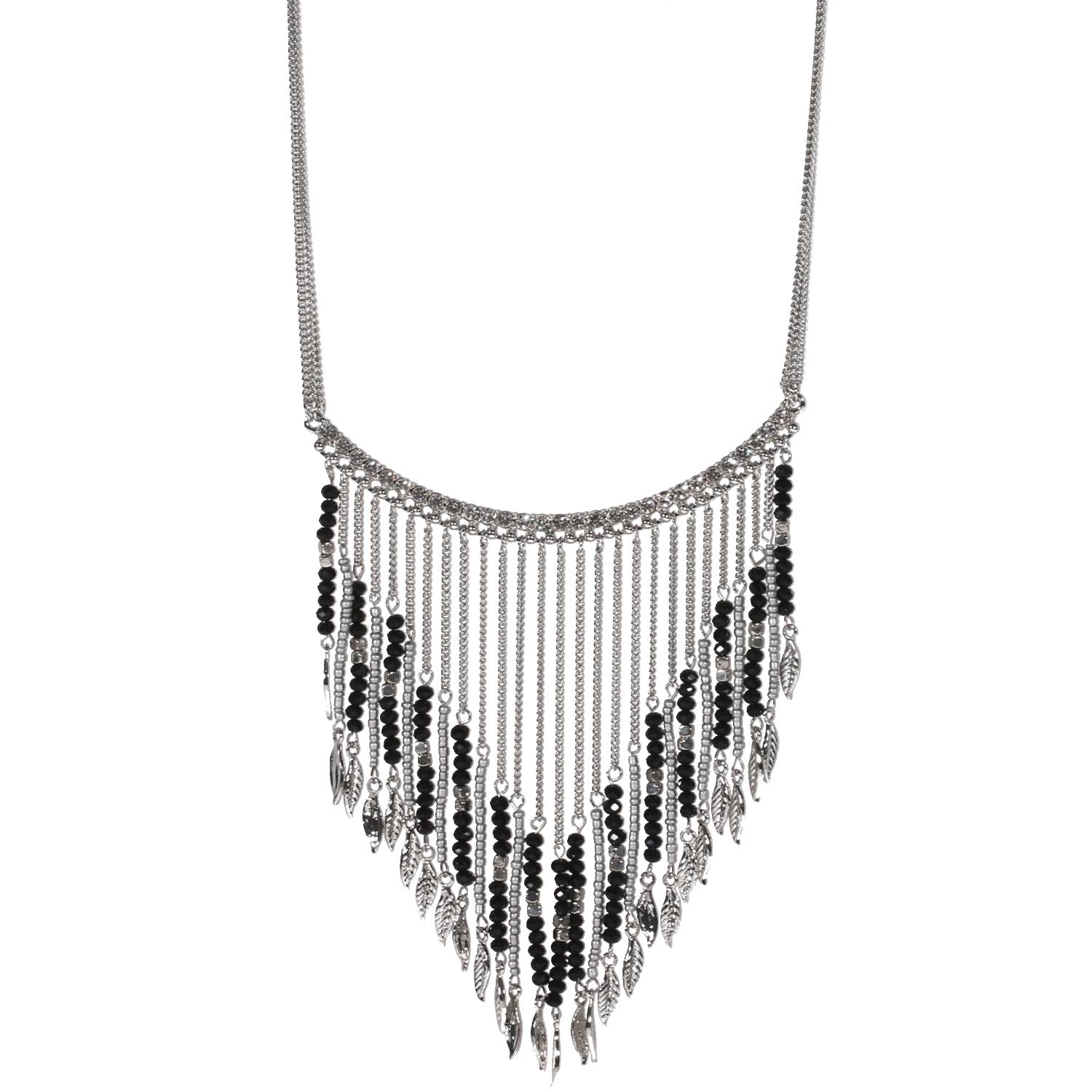 Collier fantaisie en métal argenté, rocaille et cristaux synthétiques.