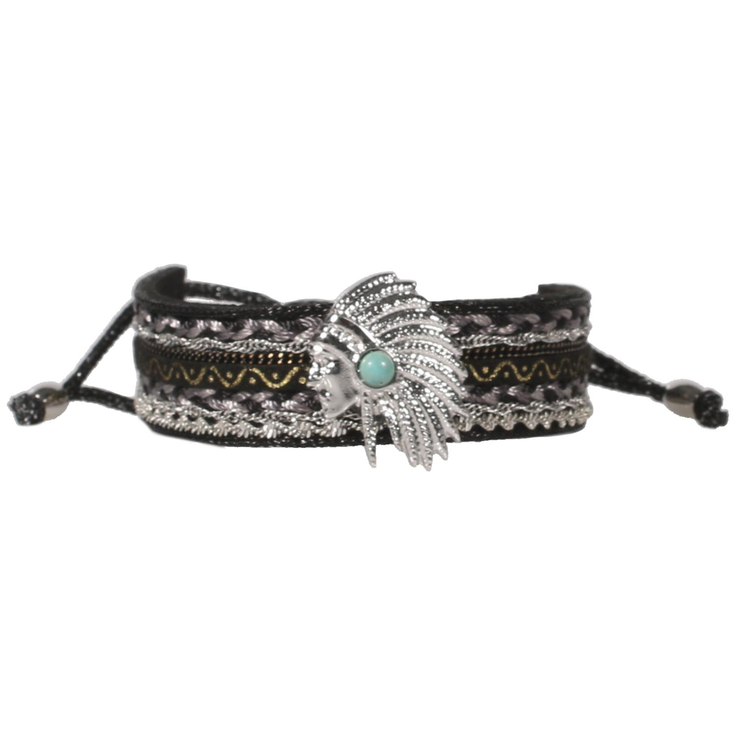 Bracelet fantaisie en métal argenté, métal peint, suédine, textile et rocaille.