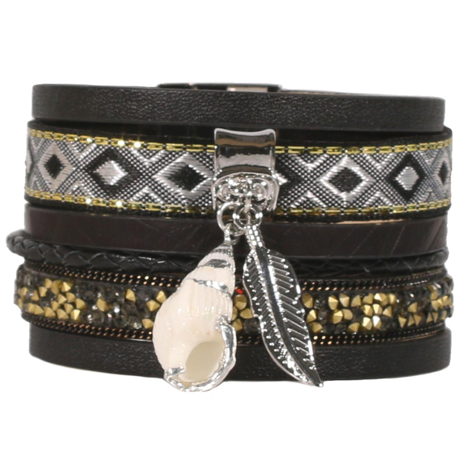 Bracelet fantaisie en métal argenté, métal doré, métal peint, suédine, polyuréthane, textile et coquillage.
