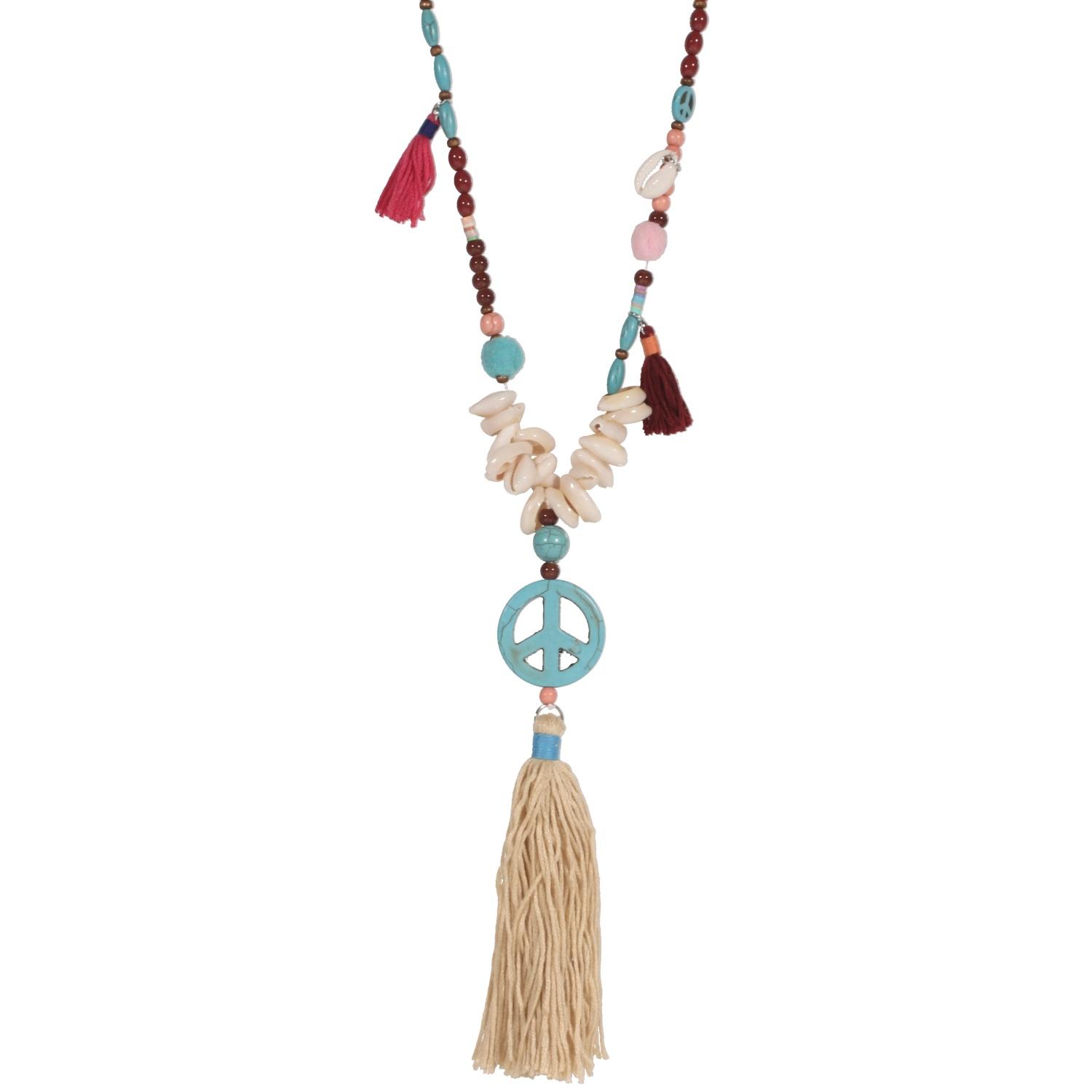 Collier sautoir en métal argenté, rocaille, bois, caoutchouc, coquillage et textile.