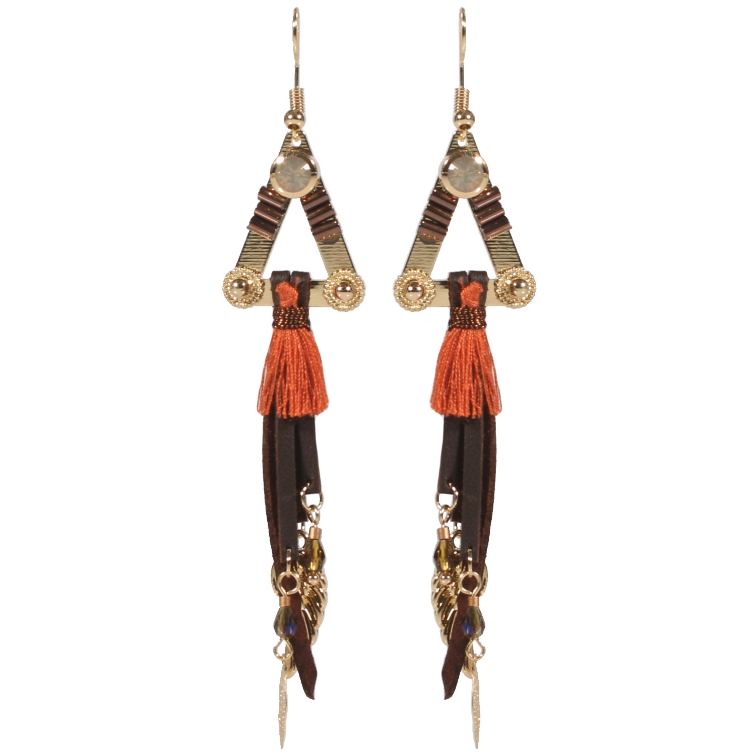 Boucles d'oreilles fantaisie en métal doré, rocaille, suédine et textile.
