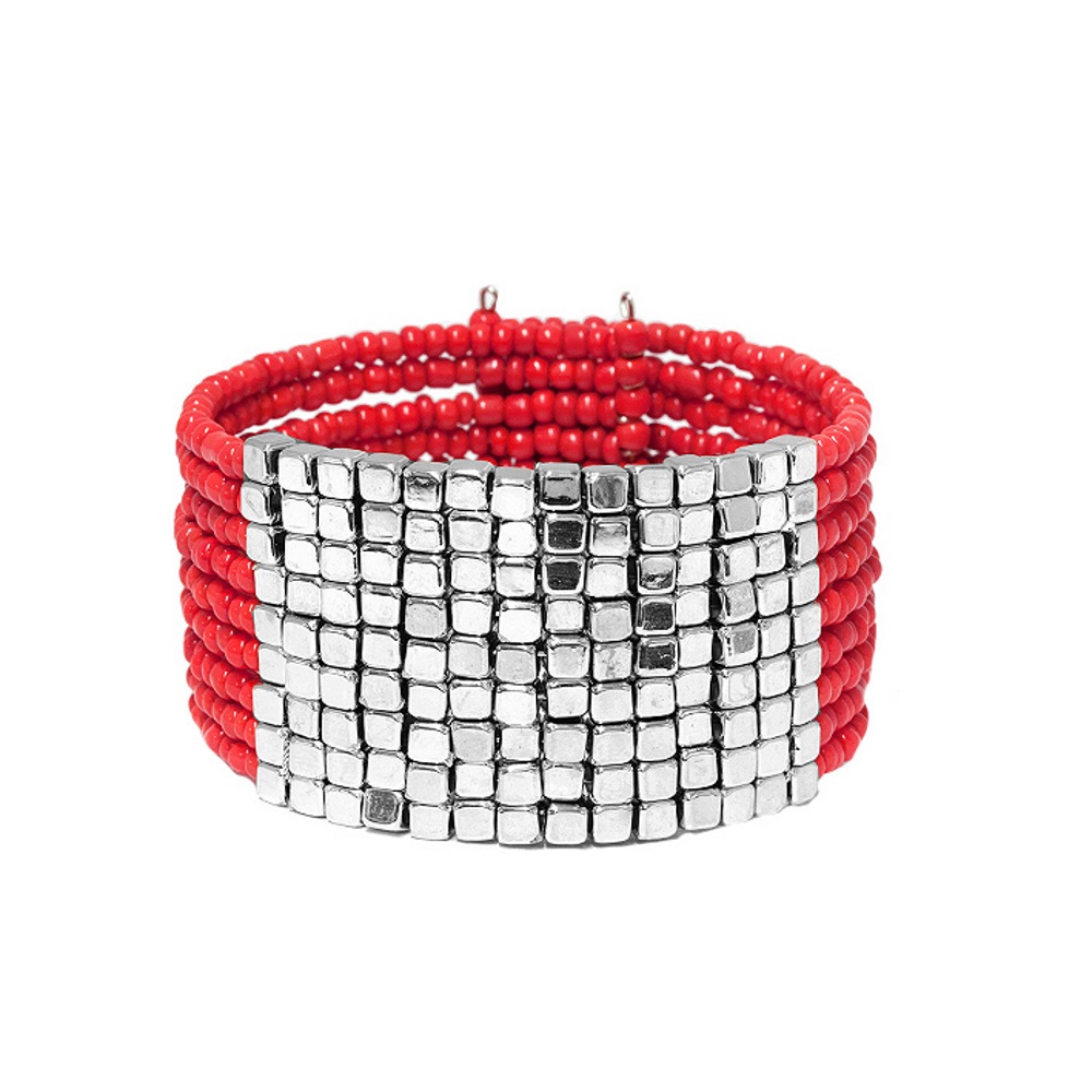 Bracelet manchette fantaisie en métal argenté et rocaille.