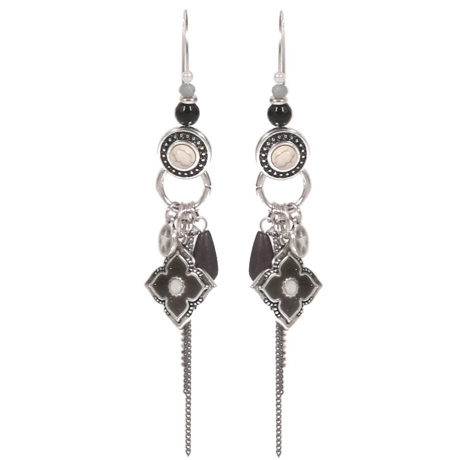 Boucles d'oreilles fantaisie en métal argenté, métal peint, émail et rocaille.