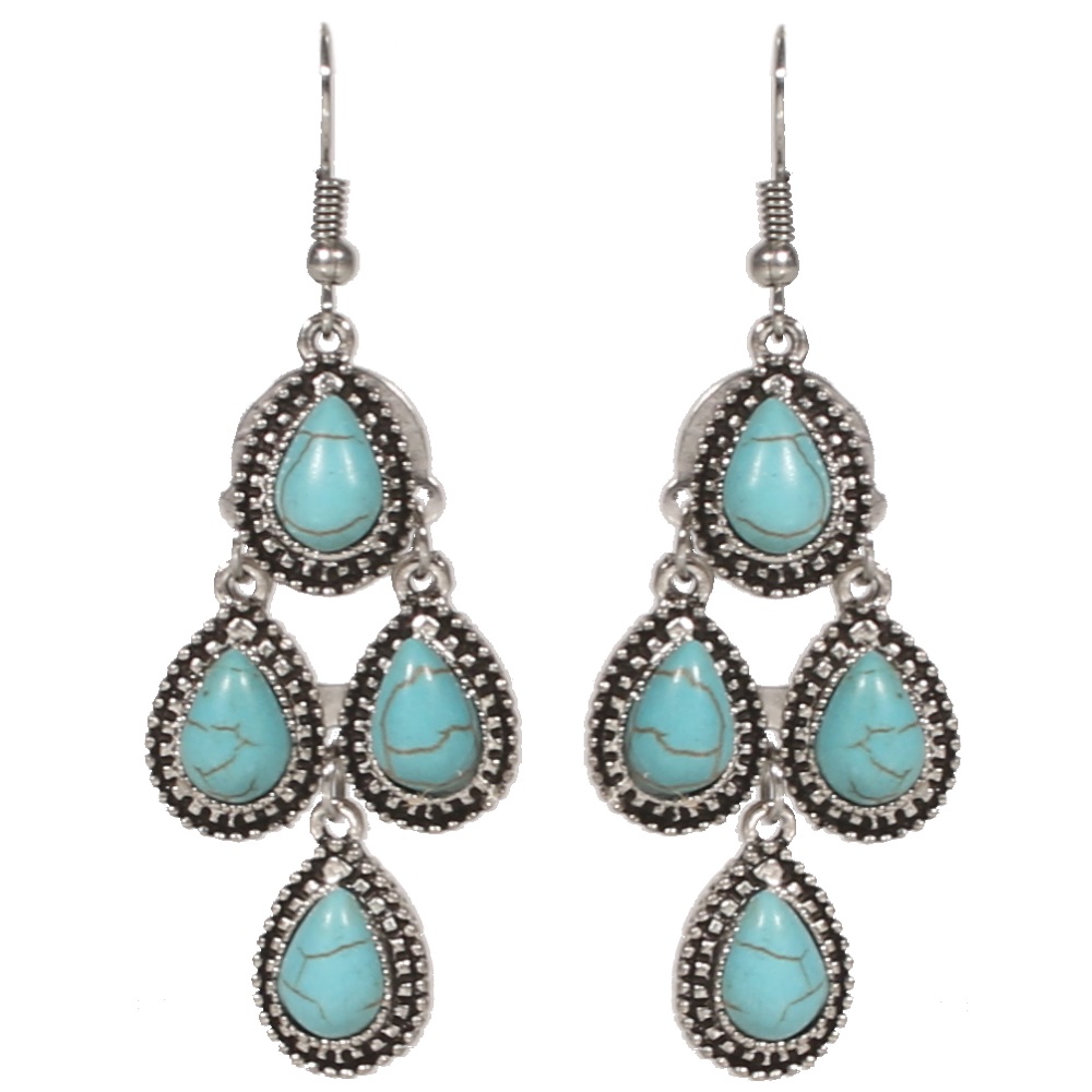 Boucles d'oreilles fantaisie en métal argenté et pierres d'imitation turquoise.