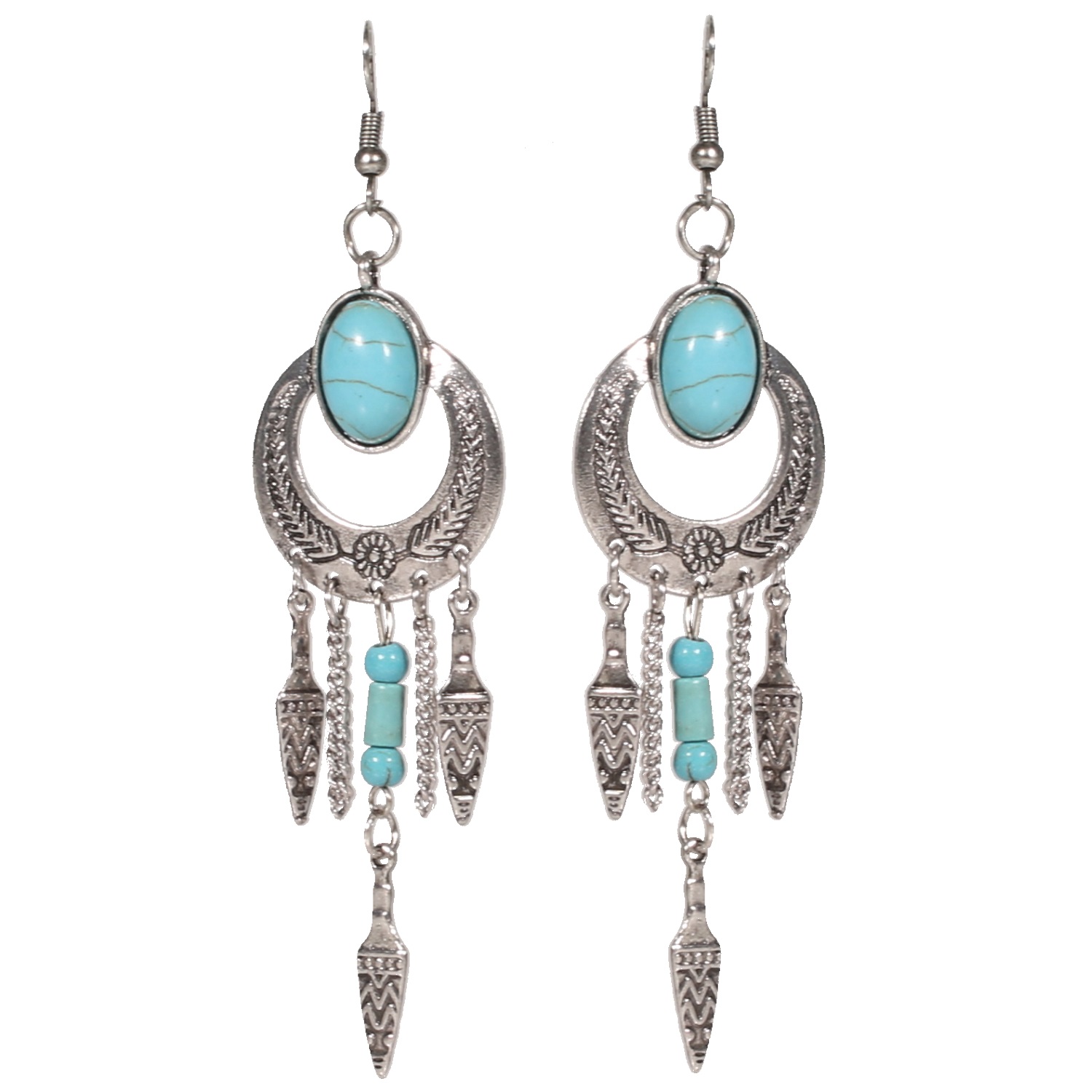 Boucles d'oreilles fantaisie en métal argenté et pierres d'imitation turquoise.