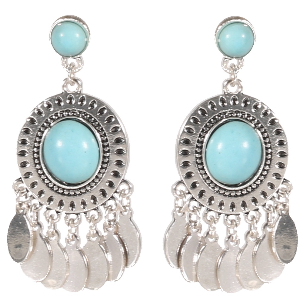 Boucles d'oreilles fantaisie pendantes Indian spirit en métal argenté et pierres synthétiques de couleur turquoise.