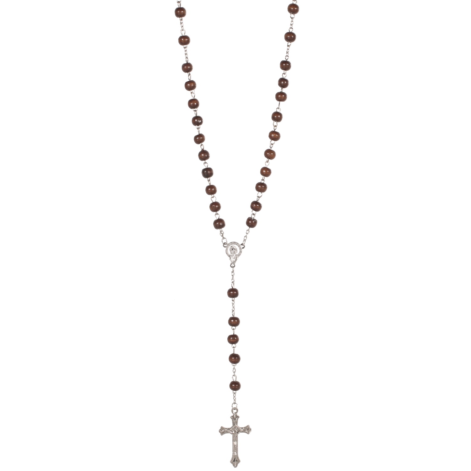 Collier sautoir fantaisie chapelet avec croix et vierge en métal argenté et perles en bois.