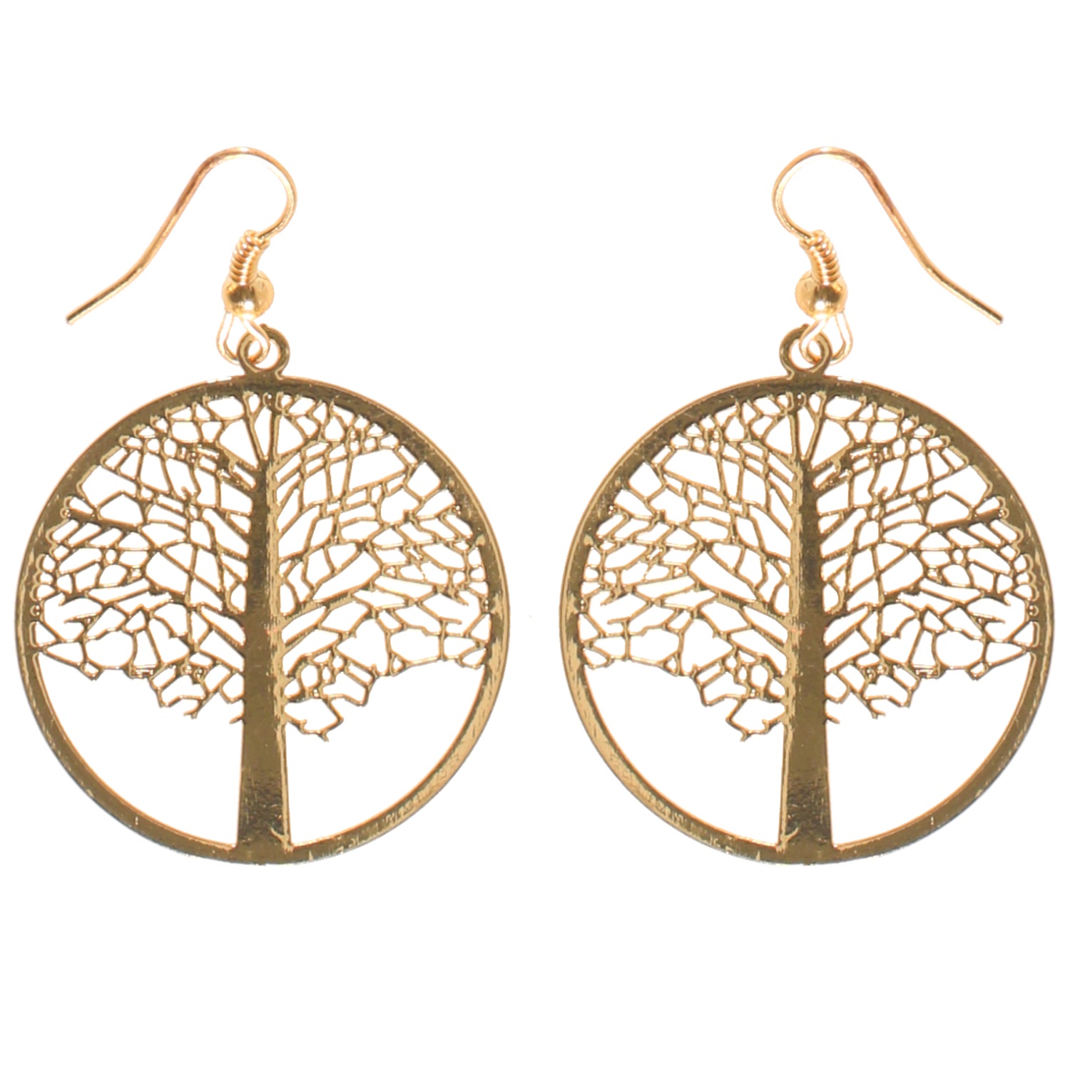 Boucles d'oreilles pendantes fantaisie arbre de vie en métal doré.