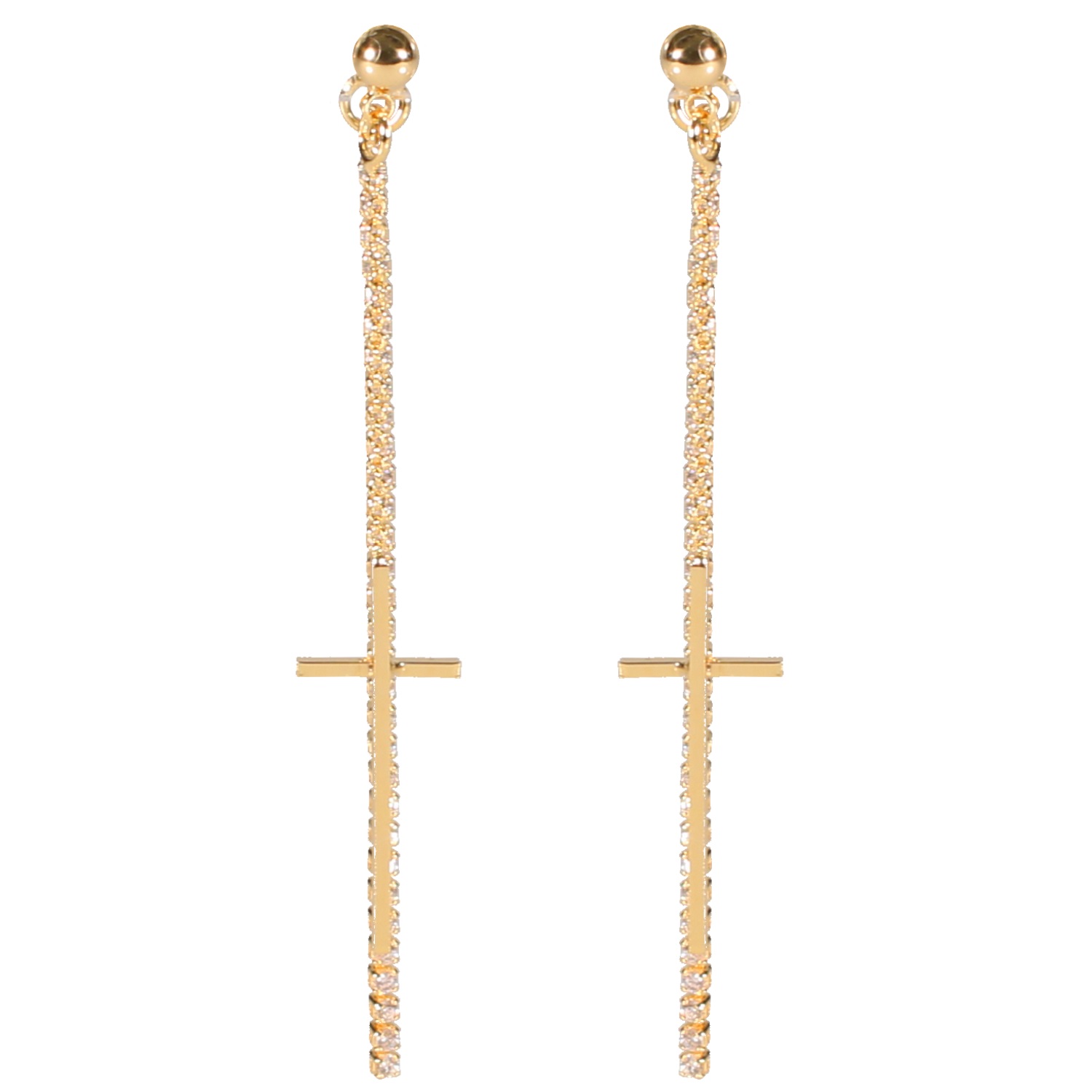 Boucles d'oreilles fantaisie pendantes croix en métal doré et strass couleur cristal.