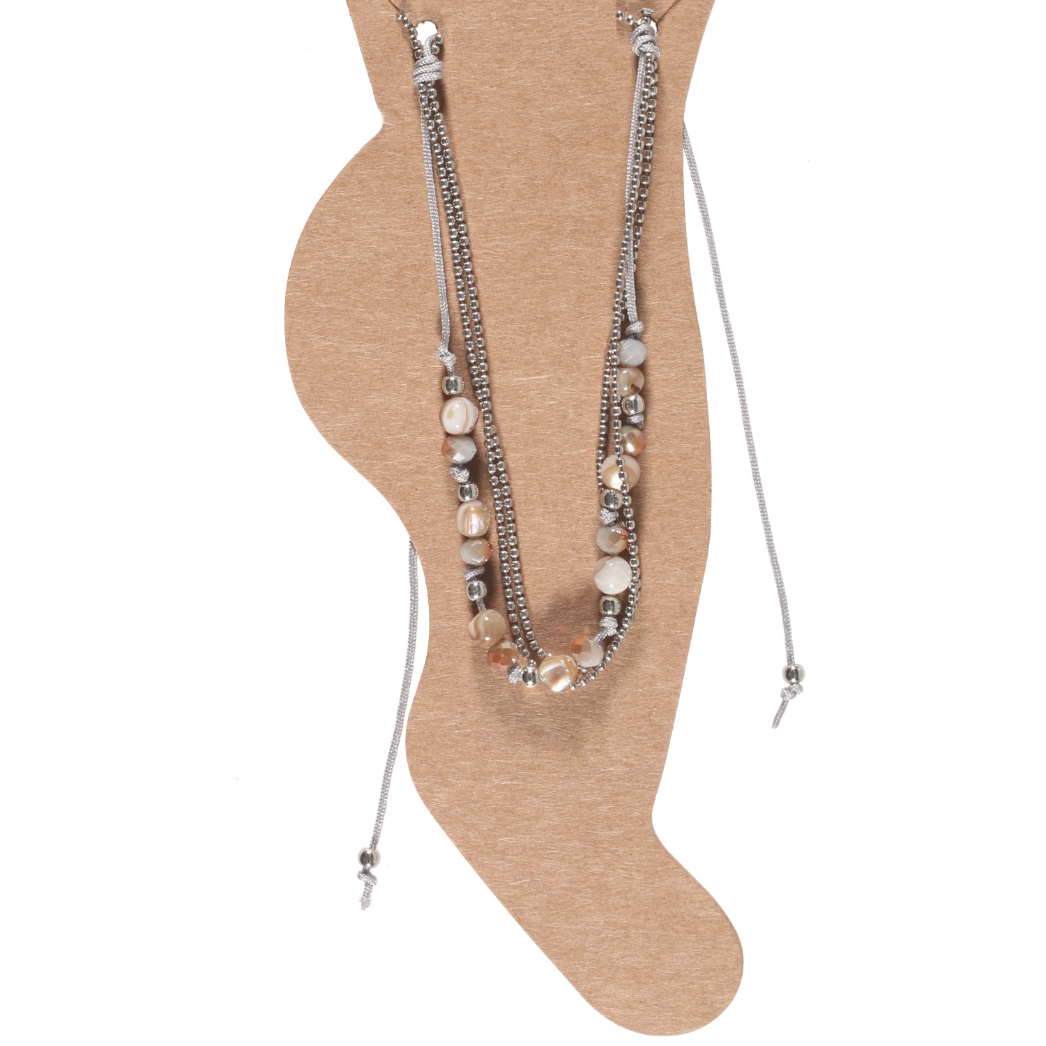 Bracelet de cheville fantaisie multi rangs en cordon en textile, chaîne boule en métal argenté, perles et pierres de couleur.