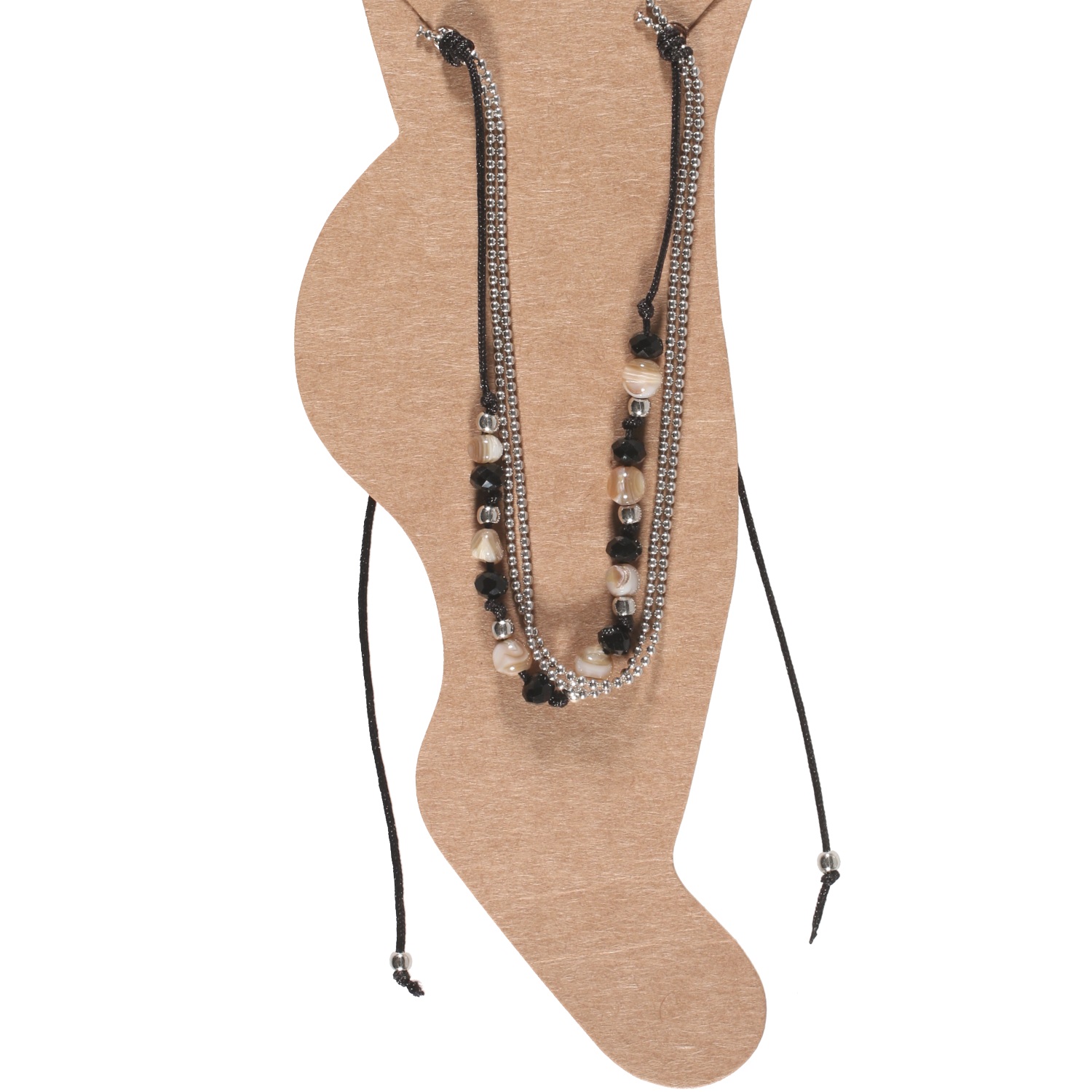 Bracelet de cheville fantaisie multi rangs en cordon en textile, chaîne boule en métal argenté, perles et pierres de couleur.