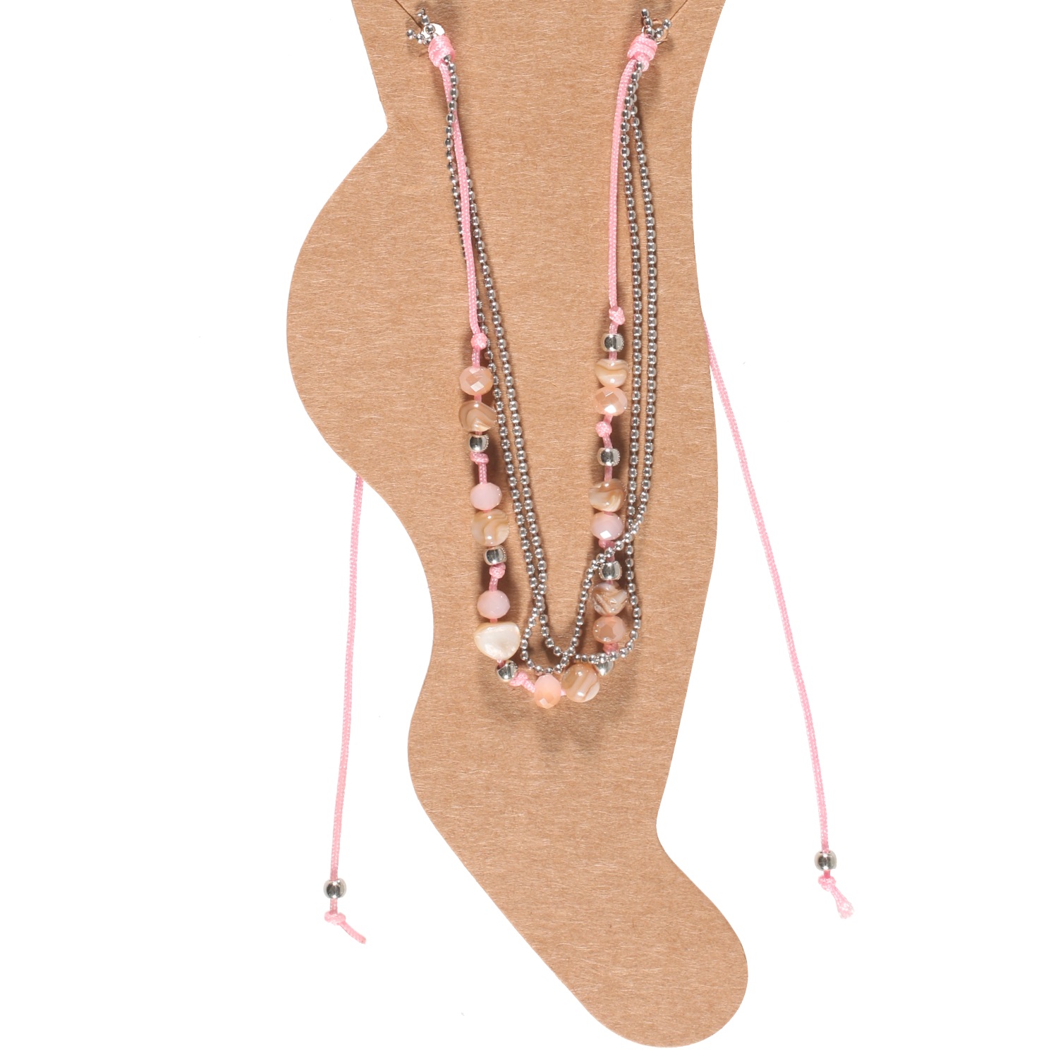 Bracelet de cheville fantaisie multi rangs en cordon en textile, chaîne boule en métal argenté, perles et pierres de couleur.