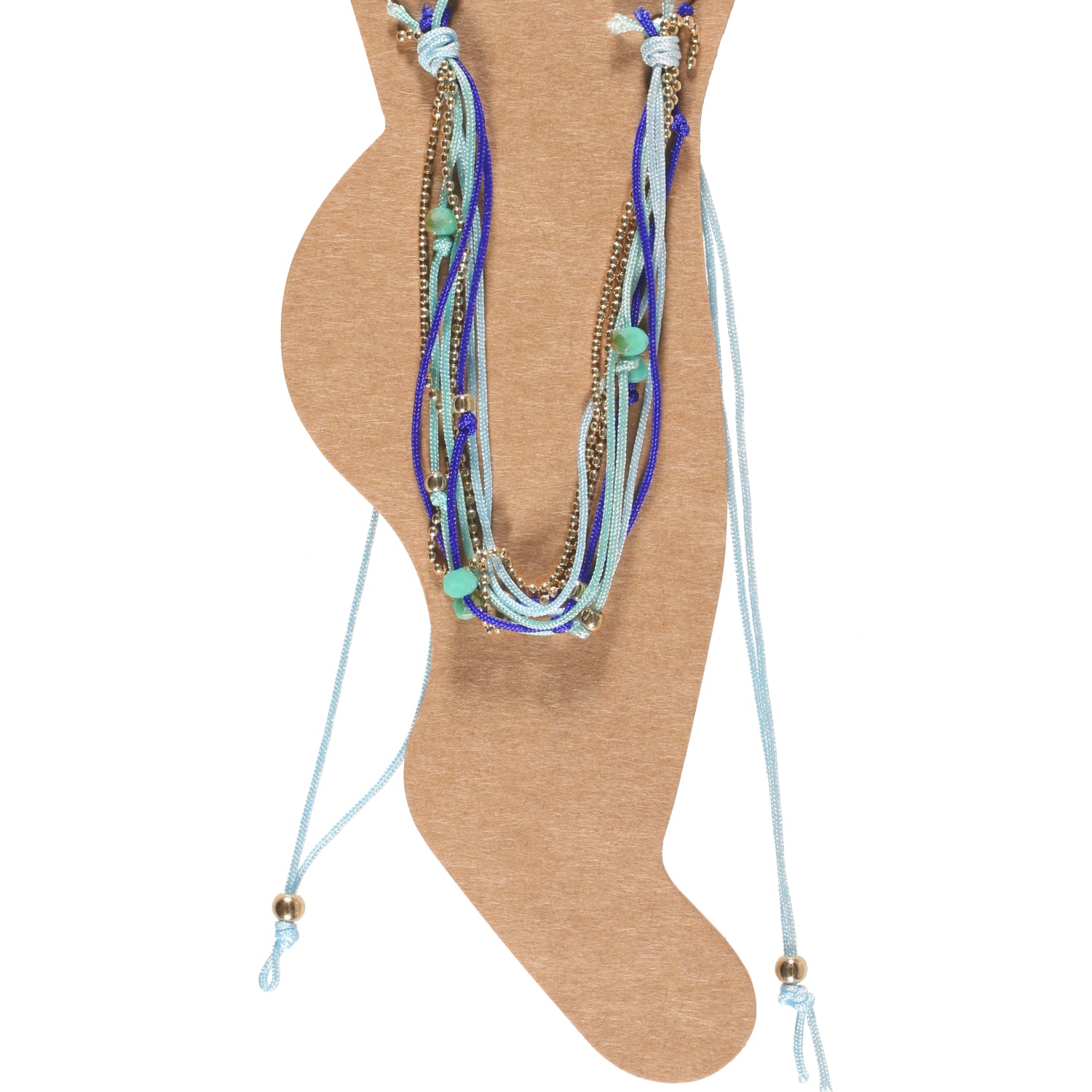 Bracelet de cheville fantaisie multi rangs avec cordon en textile, chaîne boule en métal doré, perles en métal doré et cristaux de couleur.