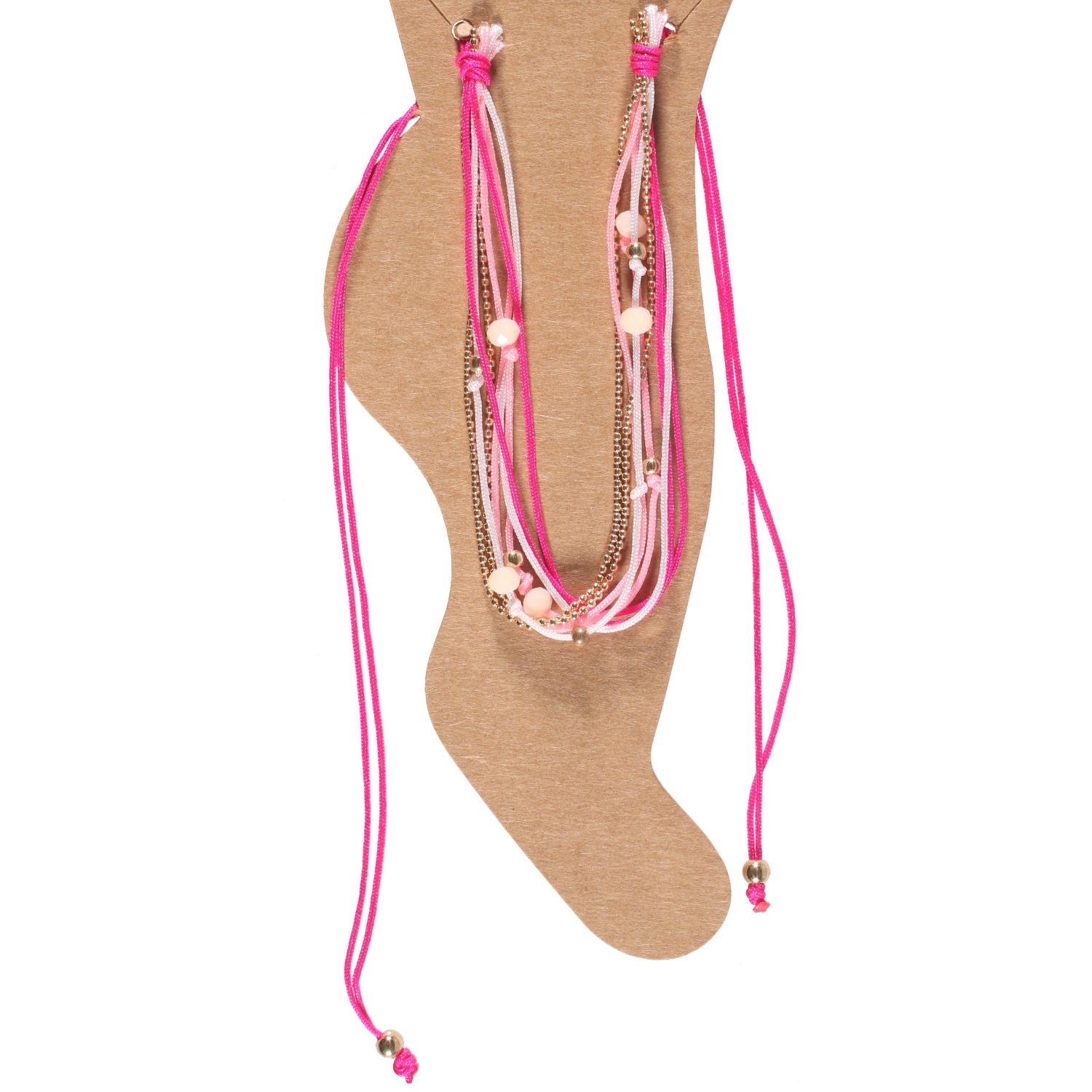 Bracelet de cheville fantaisie multi rangs avec cordon en textile, chaîne boule en métal doré, perles en métal doré et cristaux de couleur.