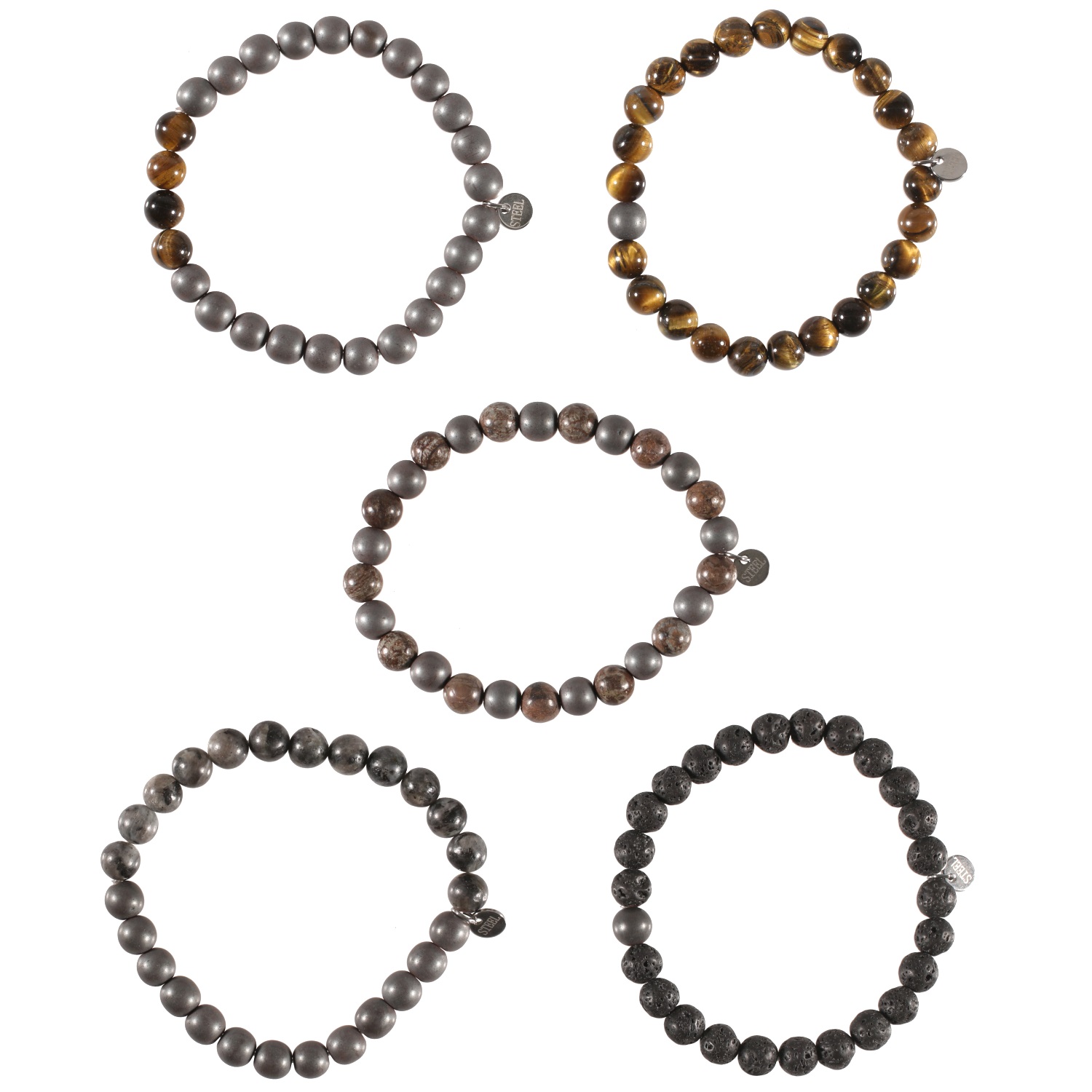 Bracelet élastique avec pendants en acier et perles en verre, en pierres et pierres d'imitation de lave volcanique.