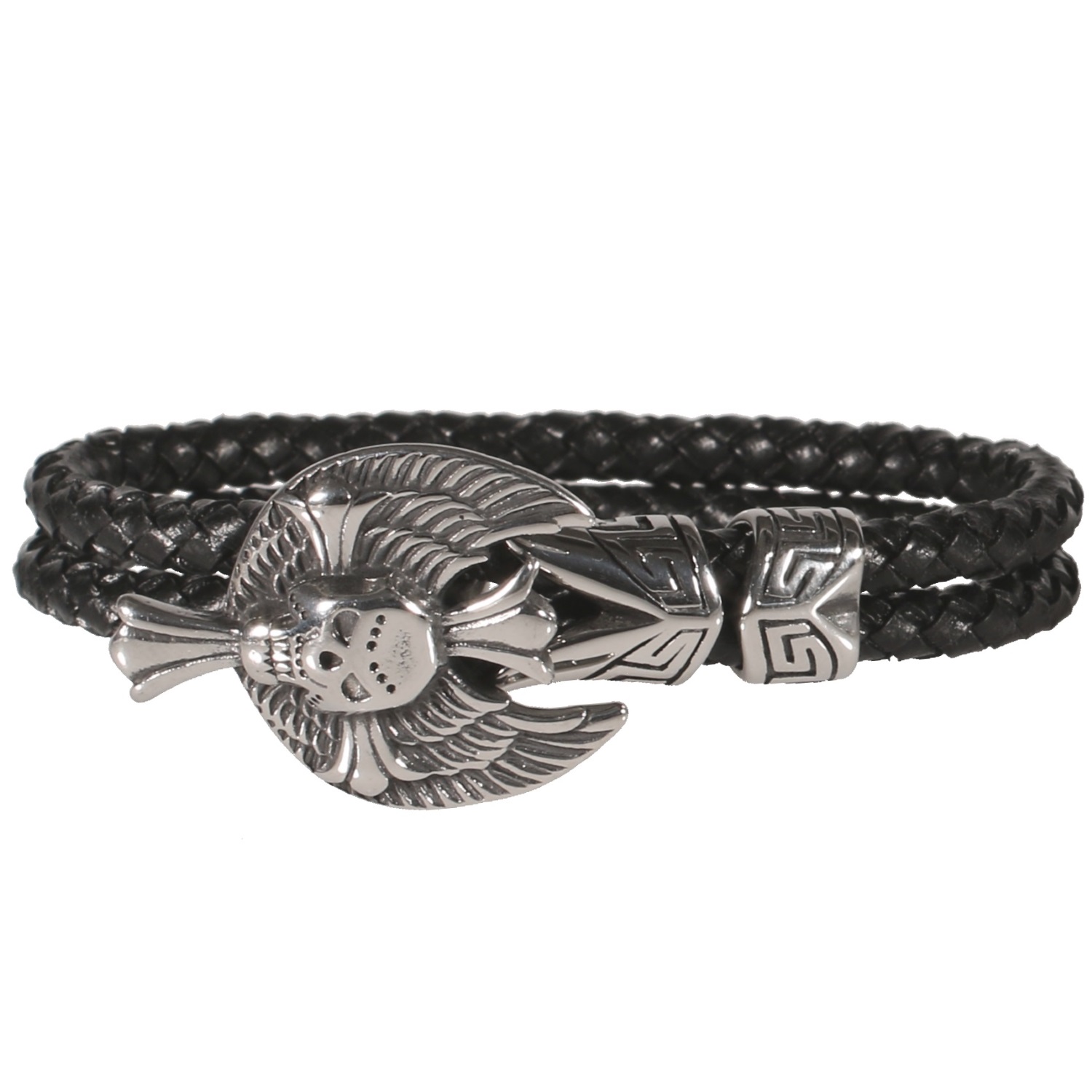 Bracelet multi rangs pour homme en cuir, croix gothique avec tête de mort et ailes en métal argenté.