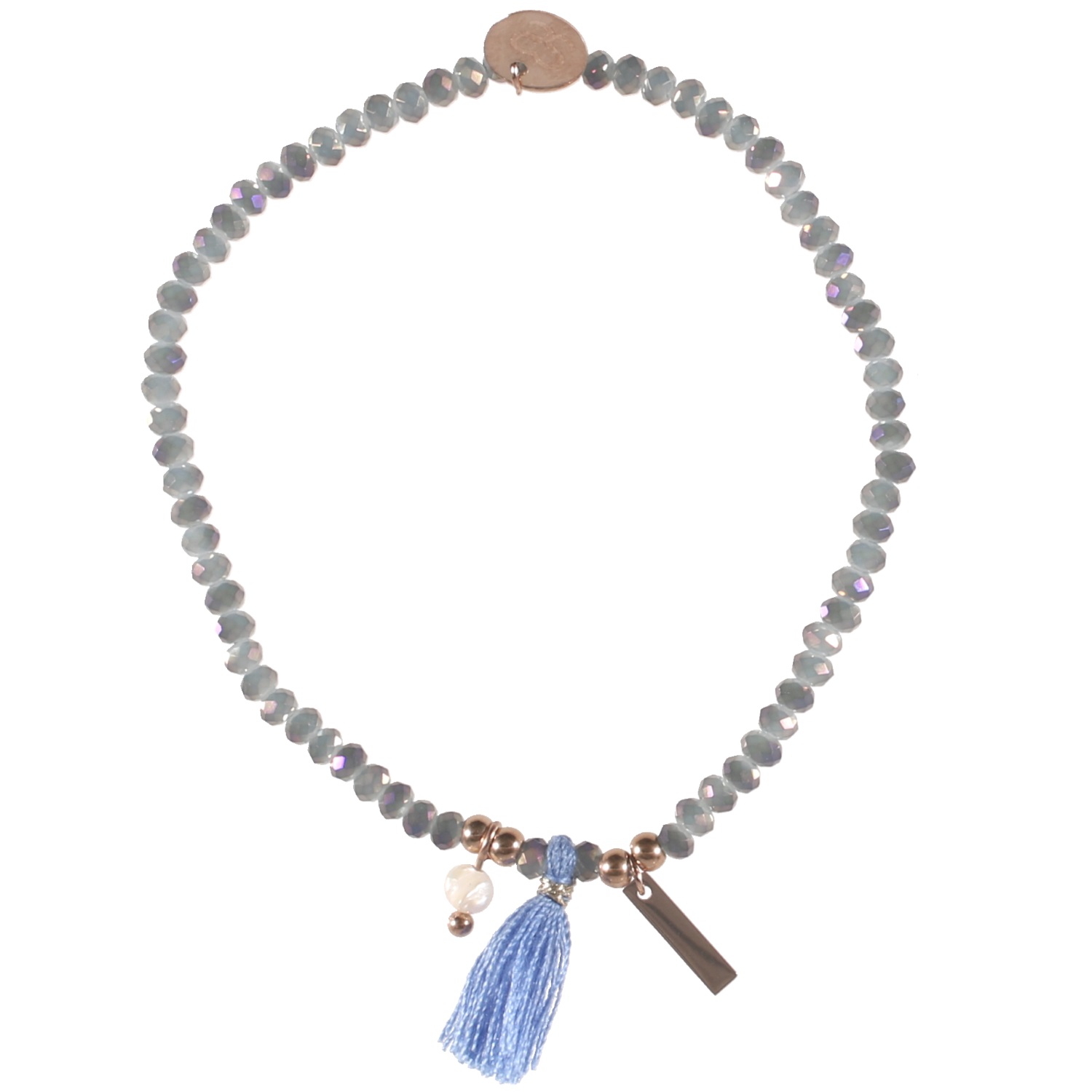 Bracelet élastique en acier rosé, perles de couleur, perle de nacre et pompon en textile.