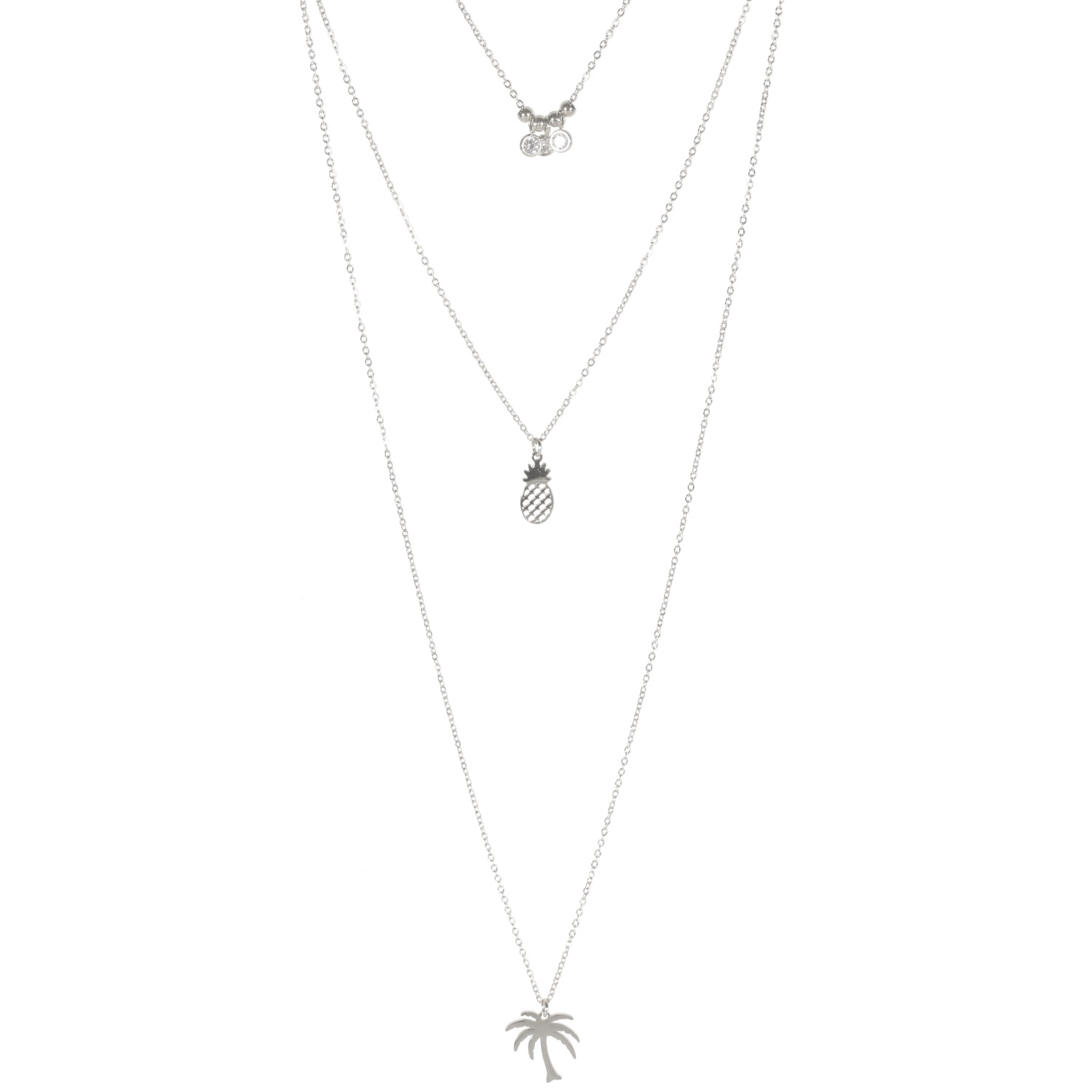 Collier multi rangs avec palmier, ananas et pendants en acier argenté et cristaux.