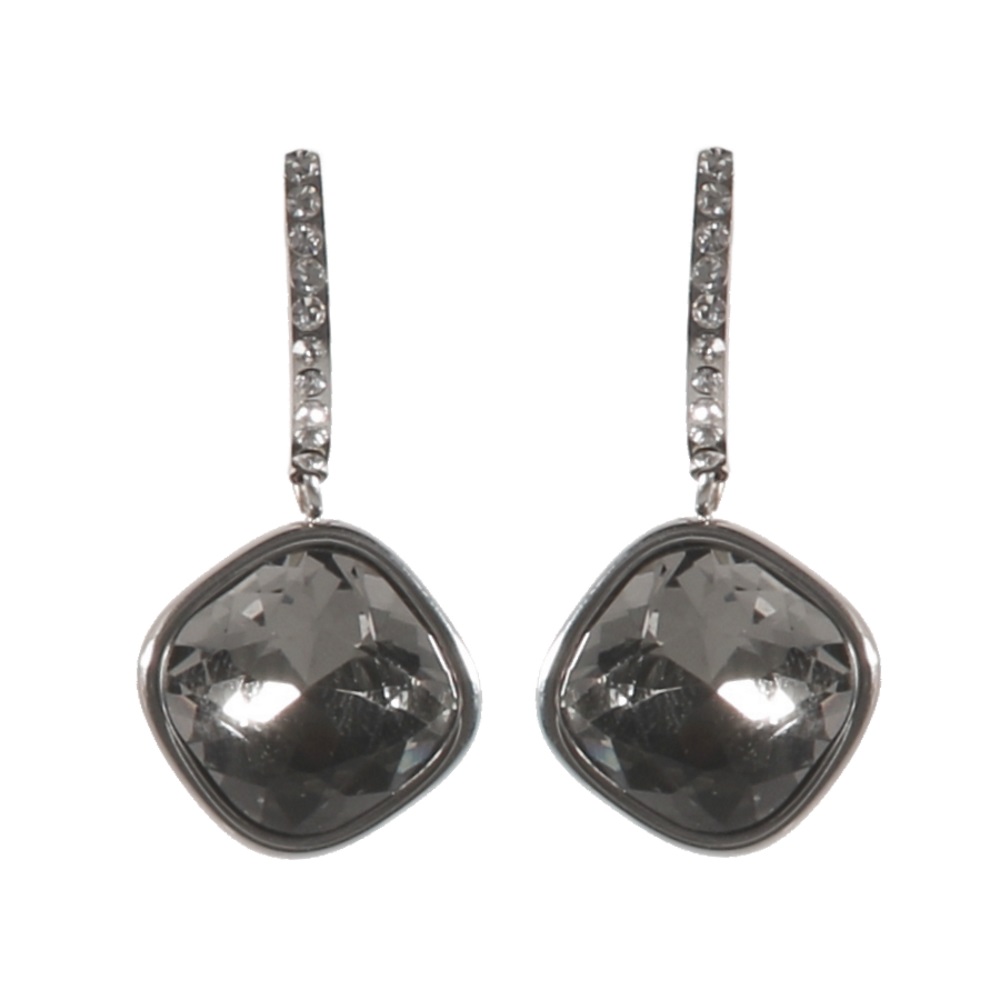 Boucles d'oreilles pendantes en acier argenté, strass et pierres de couleur.