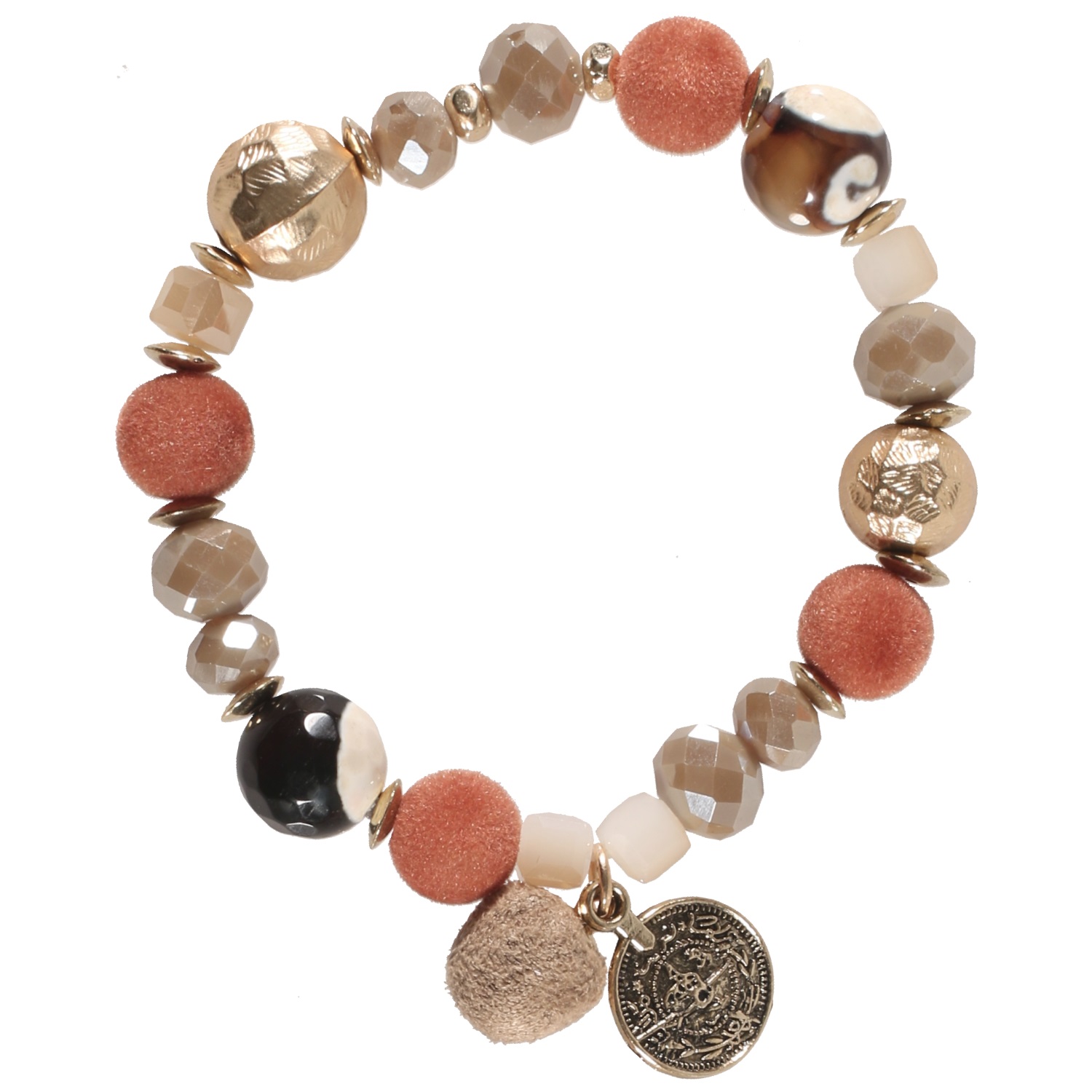 Description Bracelet fantaisie élastique avec breloques en métal doré, perles synthétiques et boules en textile. Cliquez sur une matière, un thème, une couleur ou une collection pour voir tous les articles associés.