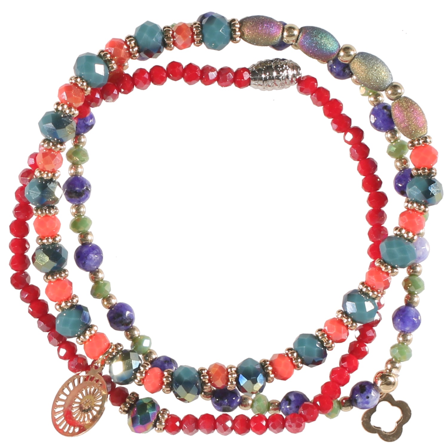 Lot de 3 bracelets fantaisie élastique avec breloques en métal doré et perles de couleur.