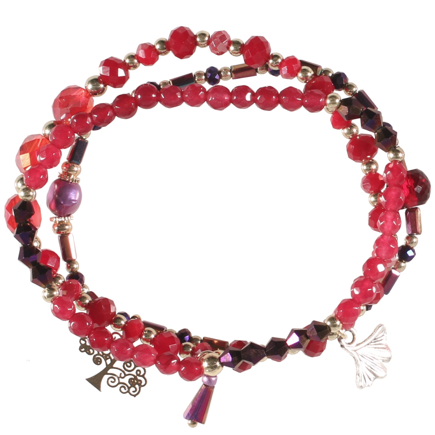 Lot de 3 bracelets fantaisie élastique avec breloques en métal argenté, métal doré, nacre et perles de couleur.