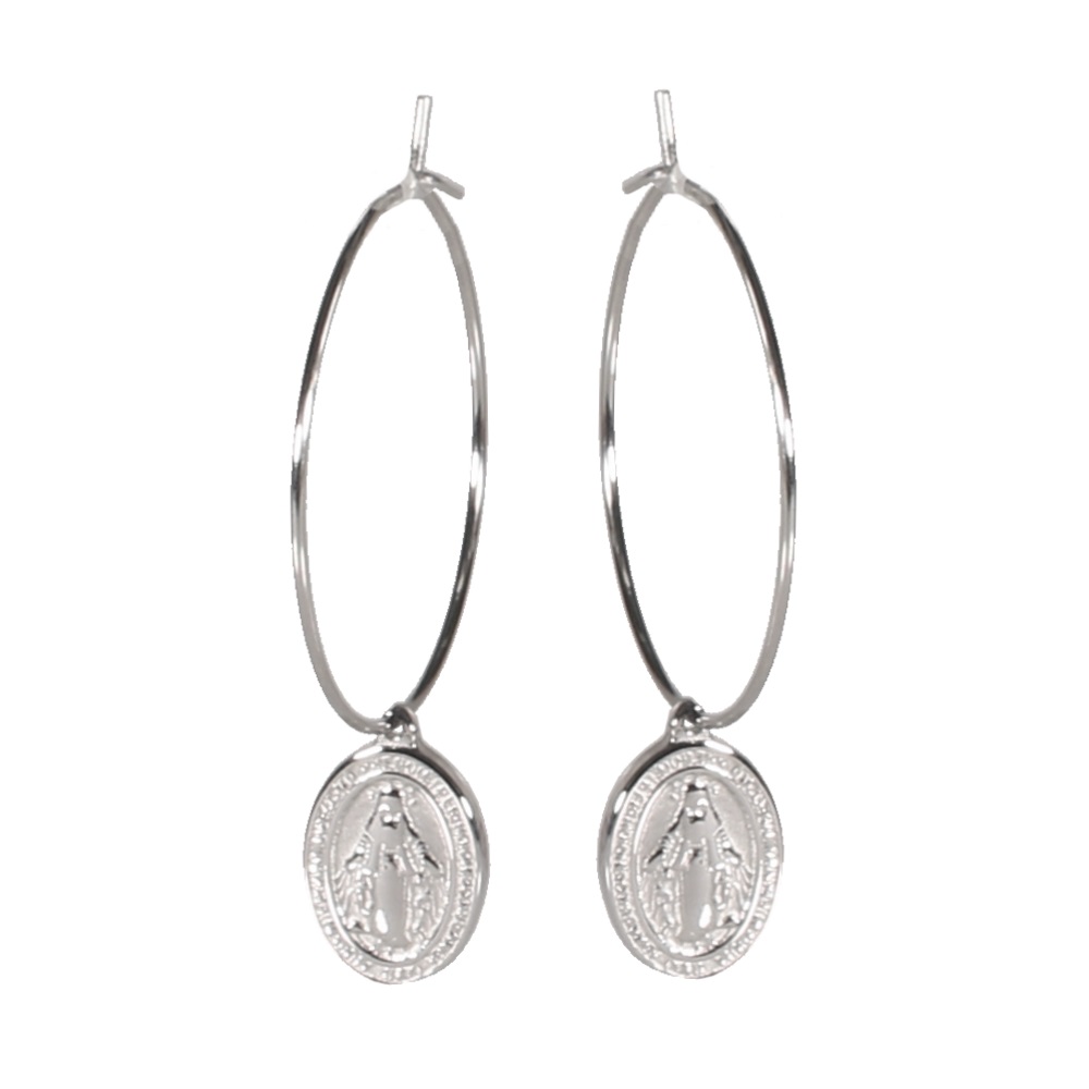 Boucles d'oreilles créoles avec pendants de la vierge en acier argenté.