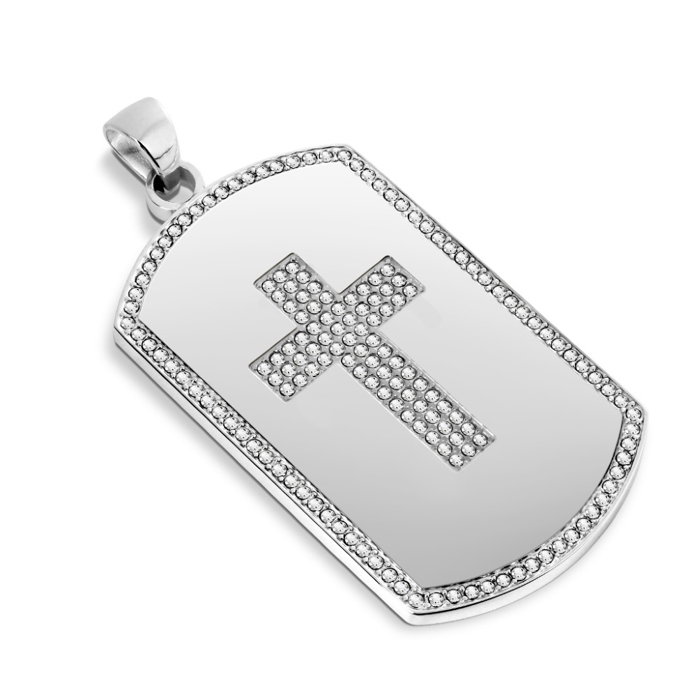 Pendentif en acier argenté avec croix et bord en oxydes de zirconium.