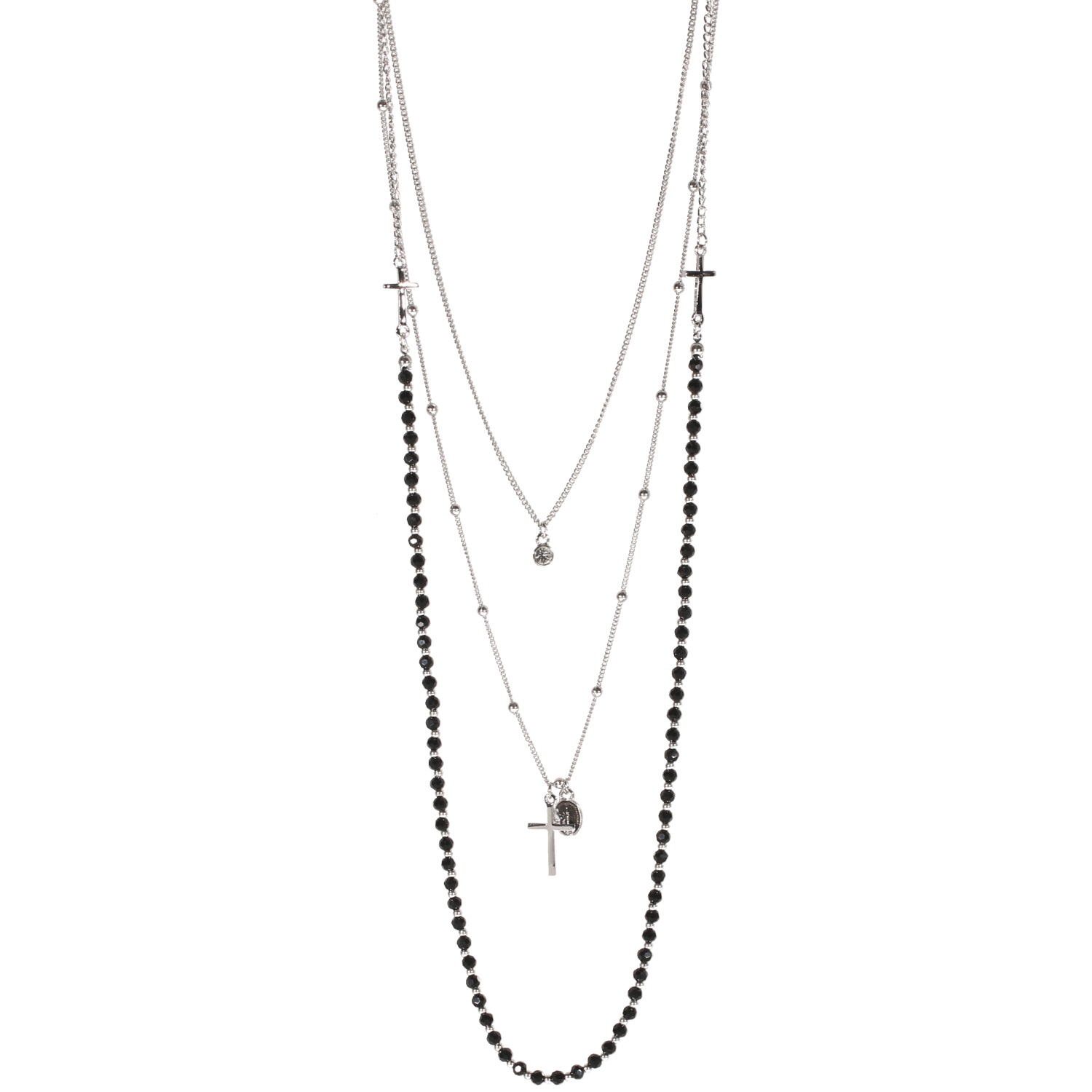 Collier sautoir fantaisie triple rangs avec pendentifs croix et vierge et boules en métal argenté, perles de couleur et cristal serti clos.