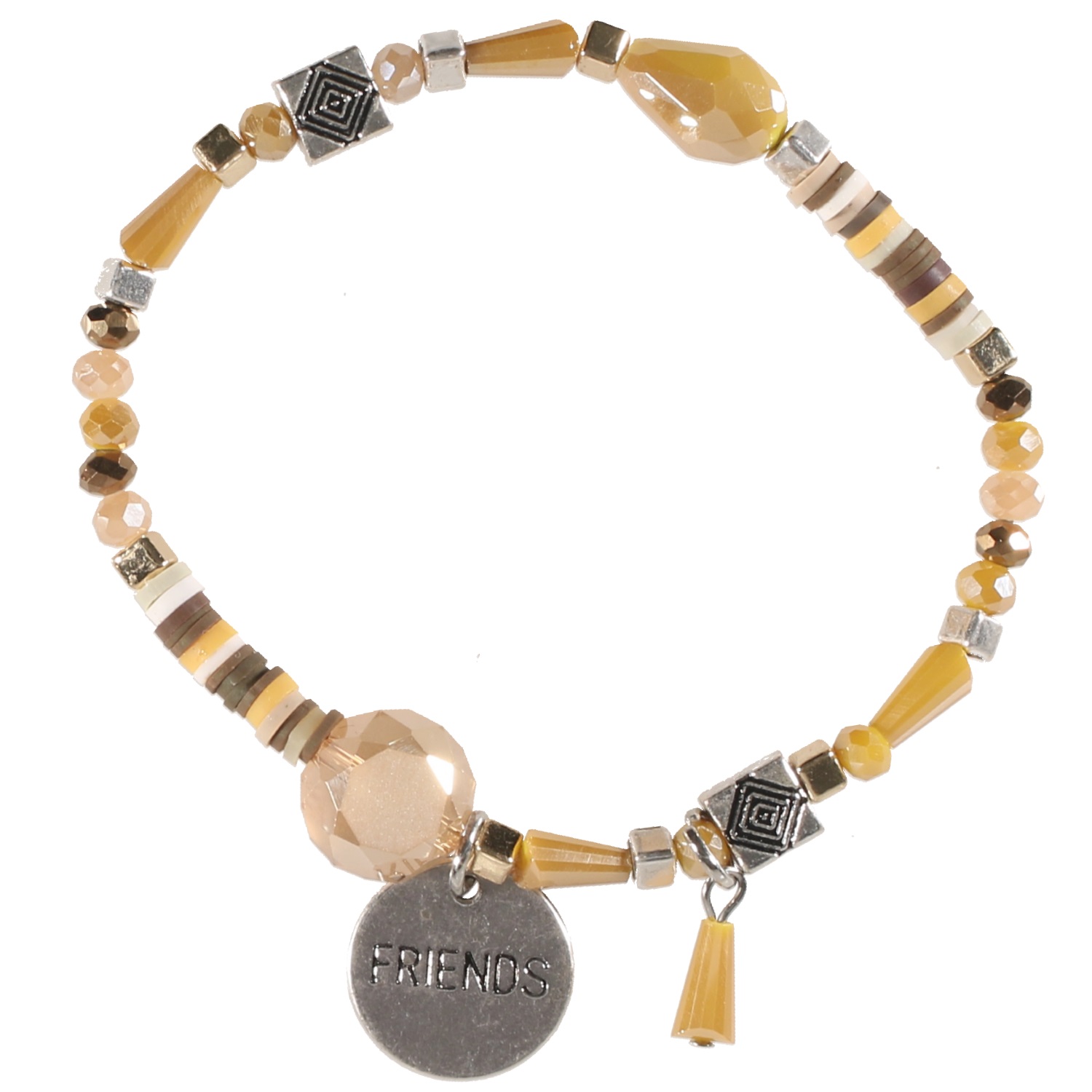 Bracelet fantaisie élastique avec pastille gravée des mots friends d'un coté et forever de l'autre en métal argenté, métal doré, rondelles de caoutchouc et perles de couleur.