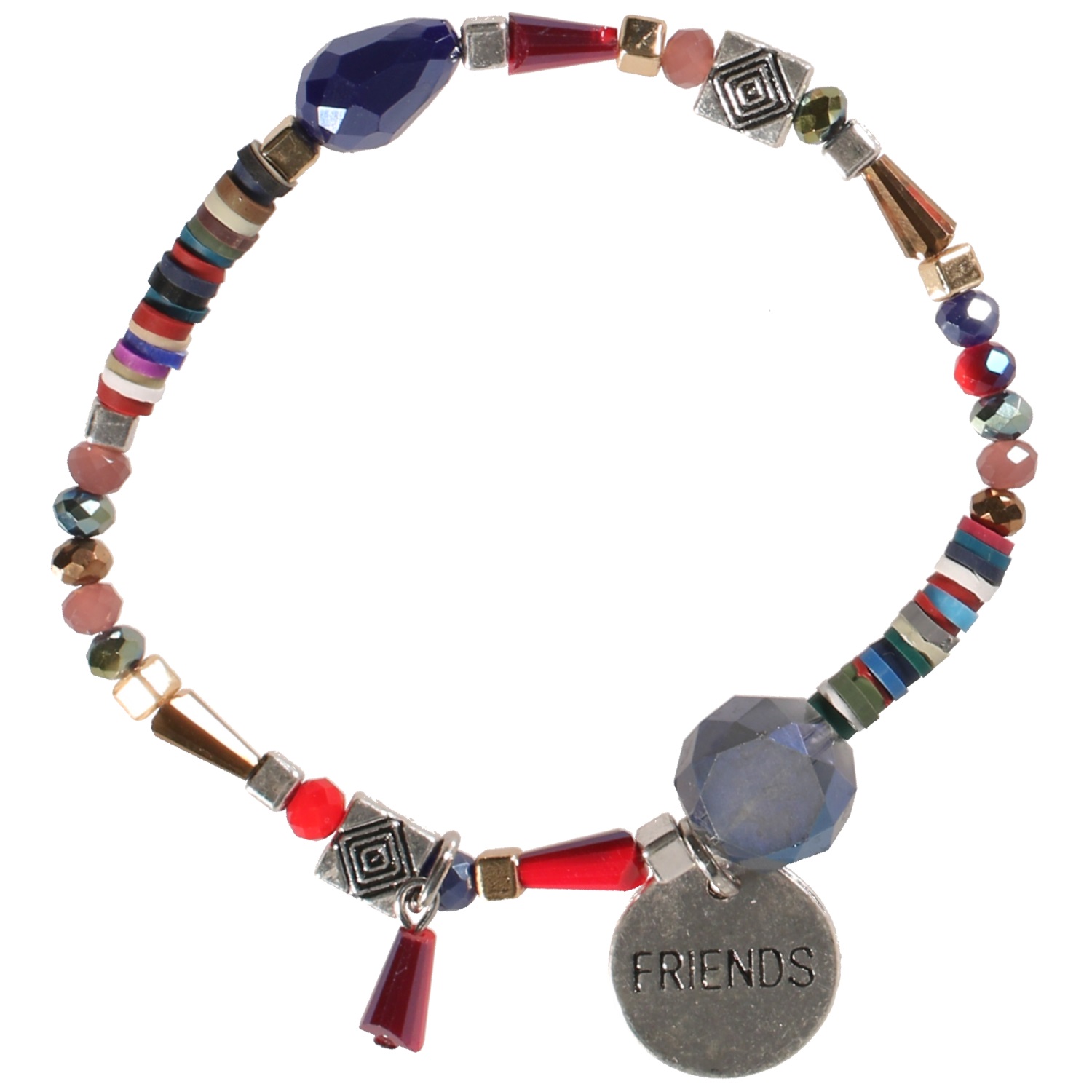 Bracelet fantaisie élastique avec pastille gravée des mots friends d'un coté et forever de l'autre en métal argenté, métal doré, rondelles de caoutchouc et perles de couleur.