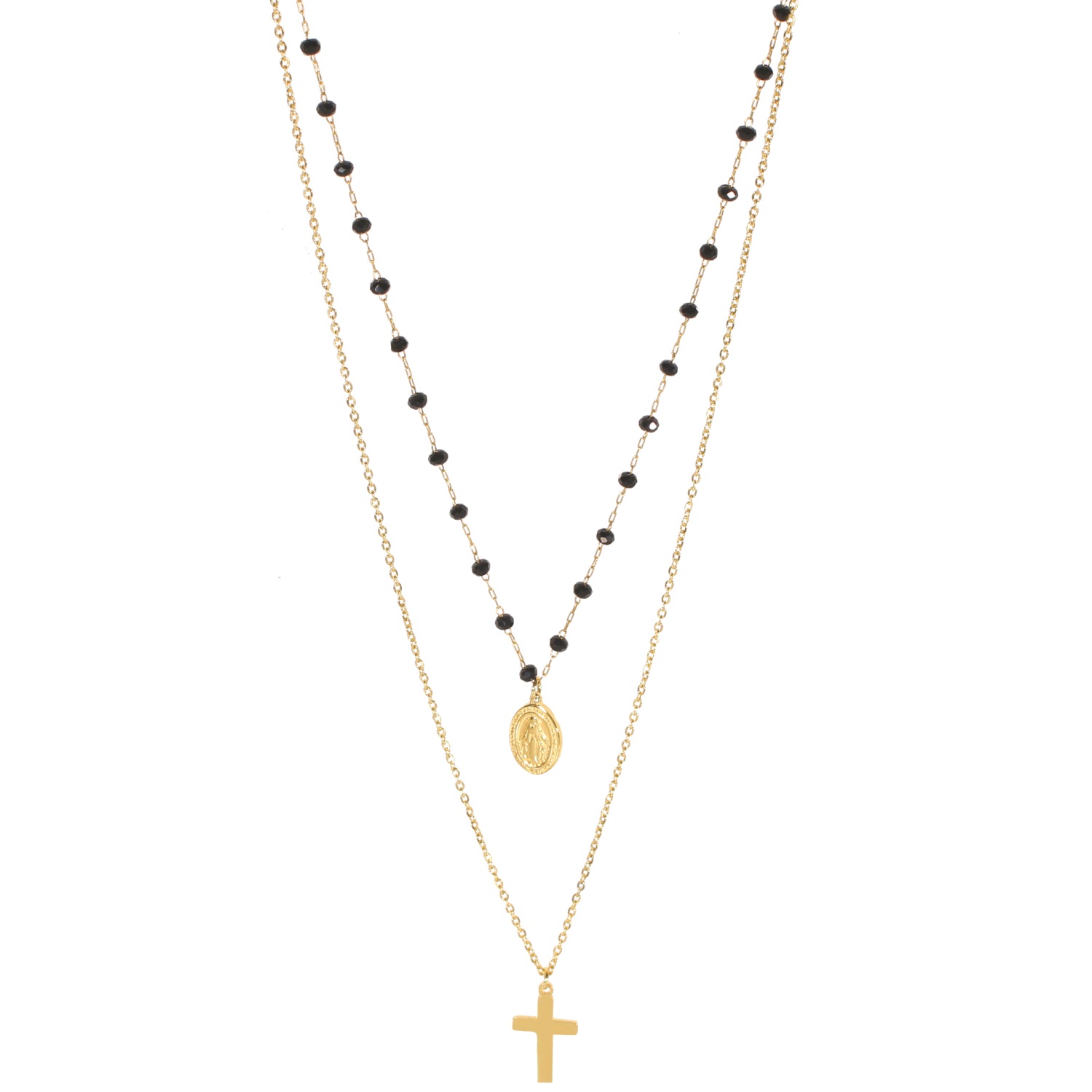 Collier double rangs avec croix et vierge en acier doré et perles de couleur.